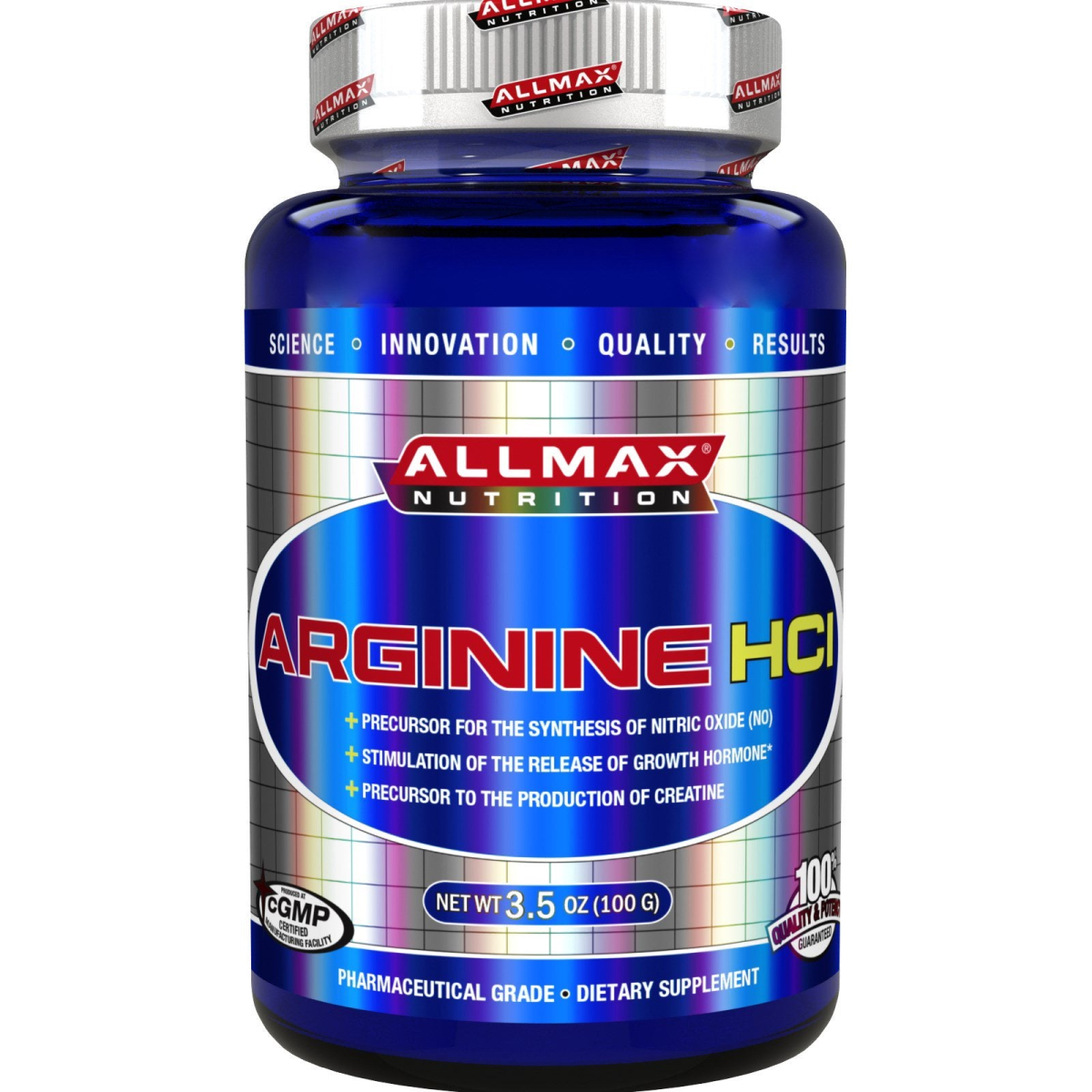 Science Innovation Quality Results Precursor for the Synthesis of Nitric Oxide (NO) Stimulation of the Release of Growth Hormone Precursor to the Production of Creatine cGMP Certified Manufacturing Facility Pharmaceutical Grade Dietary Supplement 100% Quality & Potency Guaranteed Kosher Certified Prop 65 AllMax Arginine Arginine has long been touted by research scientists and body-builders as one of the best, most effective ingredients on the market today. It has been included in virtually every top pre-workout supplement as the primary ingredient. Recent University level research confirms Arginine's ability to act as a natural precursor to Creatine synthesis in the body. It has also been shown to increase natural levels of Growth Hormones and increase the body's ability to consume and utilize oxygen, primarily due to its ability to increase levels of Nitric Oxide [increase Vasodilation]. The AllMax Arginine Advantage: AllMax Arginine is a Japanese-Grade ultra-pure white crystalline powder produced in a pharmaceutical grade and government inspected facility. An exclusive 11-stage process derives this powerful amino monopeptide from a pure vegetable base. This means no potential animal contamination and no animal by-product sources. AllMax Arginine crystals are ultra ground using the latest technological processes to achieve and ultra micro-fine powder for rapid absorption and biological utilization. Most research indicates 6 to 9 grams per day to achieve maximum benefit. By comparison, regular Arginine capsules provide only 500 to 750 mg, less than a single gram of Arginine! AllMax Quality Guarantee: AllMax Arginine is produced at a cGMP licensed, government inspected manufacturing facility ensuring product quality and integrity. Every ingredient added and every lot produced is independently lab tested for purity and potency ensuring consistency quality every time.