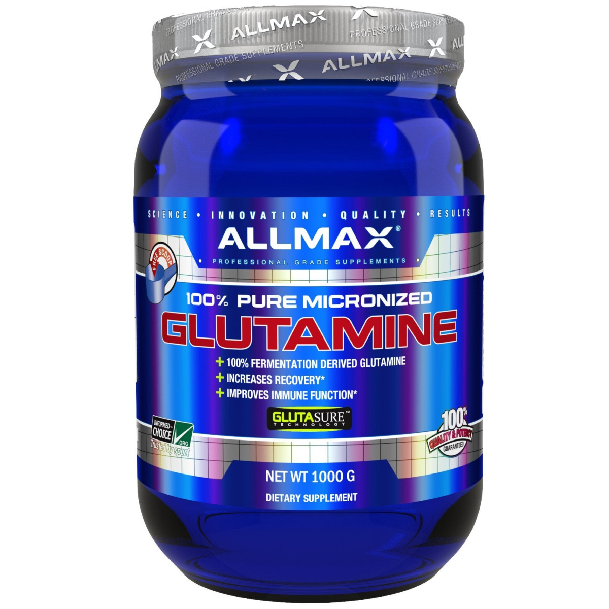 Science - Innovation - Quality - Results Professional Grade Supplements Free Scoop 100% Fermentation Derived Glutamine Increases Recovery Improves Immune Function Glutasure Technology Informed-Choice - Trusted by Sport Dietary Supplement 100% Quality & Potency Guaranteed cGMP Registered Facility Gluten Free Vegetarian Vegan Kosher Certified Informed-Choice Certified - Tested for Banned Substances AllMax Glutamine AllMax Glutamine uses 100% Pure Glutamine crystals made from a natural fermentation process. This state-of-the-art process creates a unique, purified and isolated Glutamine ideal for supplementation. Glutamine is the most abundant amino acid found in muscle tissue. During times of stress, including exercise and athletic events, Glutamine is one of the first amino acids to be oxidized. Supplementation with Glutamine may help to support muscle Glutamine levels, prevent muscle tissue breakdown and increase recovery. The Glutasure Advantage: AllMax Glutamine uses proprietary hyper-particulation process called Glutasure technology. Glutasure is a pressure driven ceramic membrane process that: Decreases Glutamine particle size. Increases Glutamine suspension time in liquid. Speeds Glutamine absorption into the bloodstream.