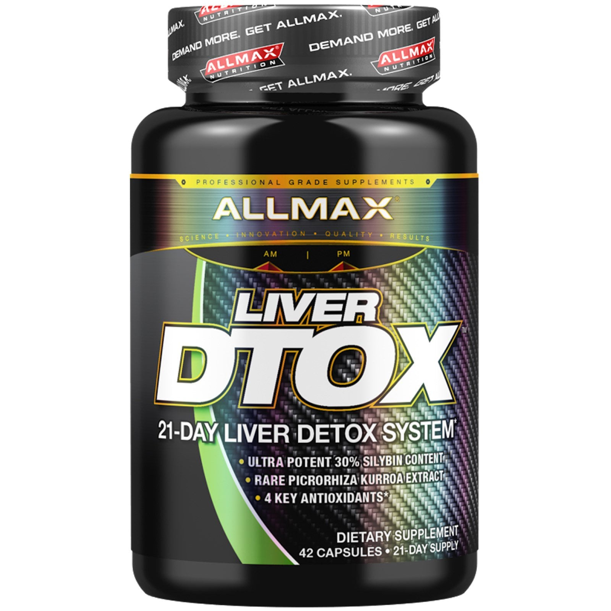 Professional Grade Supplements Science - Innovation - Quality - Results AM - PM Dietary Supplement 21-Day Supply 3rd Party Tested - Every Ingredient Every Lot CGMP Certified Facility 21-Day Liver Detox System Ultra Potent 30% Silybin Content Rare Picrorhiza Kurroa Extract 4 Key Antioxidants The Ultimate 21-Day Liver D-Tox The human liver is considered by many to be the most crucial organ. It is responsible for cleansing blood, protein synthesis, biochemical production, glycogen storage and even plays a major role in metabolism. Liver D-Tox is a combination of clinically proven herbal extracts in their purest form along with powerful Vitamin Antioxidants such as Vitamins C & E, Selenium and NAC (N-Acetyl-Cysteine). The Milk Thistle Extract (MTE) that we have sourced is not only standardized for 80% Silymarin, but also standardized for the lesser known, but highly potent 30% Silybin content. MTE is widely known for its proven ability to reduce liver hepatoxins and is often employed to ensure a return to a cleansed state. AllMax has sourced a 95% pure Curcumin Extract renowned for its potent detoxification and antioxidation functions. Artichoke Extract at 5% Cynarin has been included for its hepaprotective function. Katuka Extract has a centuries long tradition in Ayurvedic medicine as a liver tonic. As athletes, we put our livers through a lot. We depend heavily on it for everything from protein digestion to blood toxin cleansing. If you want to perform at the highest levels, you owe it to yourself to do a 21-Day Liver D-Tox.