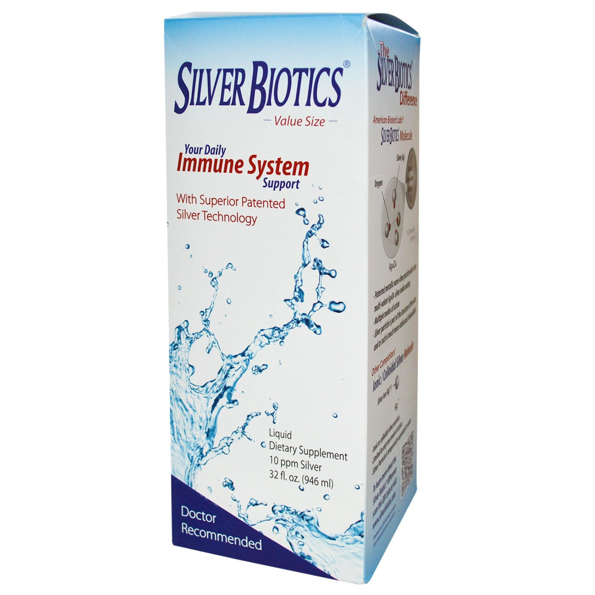 Value Size 10 PPM Silver Your Daily Immune System Support With Superior Patented Silver Technology Liquid Dietary Supplement Doctor Recommended 100% Vegetarian and Gluten Free The Silver Biotics Difference American Biotech Labs Silver Biotics Molecule Patented metallic nano-silver particle with a thin multi-valent Ag4O4 silver oxide coating Multiple modes of action Silver particle is part of the structure of the water and as such is much more stable and bioavailable Other Competitors Ionic / Colloidal Silver Molecule Ionic or colloidal silver particle Limited to only one mode of action Silver Particle is temporarily suspended in water Ultimate Immune System Support Designed to be used daily as an Immune Support Supplement Clinically Formulated Successfully Studied and recommended by Medical Professionals Tested by Major Universities and Certified Independent Laboratories Patented Manufacturing Process, Product, and Uses