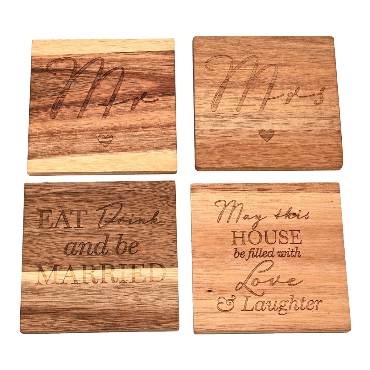 Celebrate their special day with a practical gift. Complete with four wooden coasters featuring an assortment of captions, this set is perfect for a newly wed couple moving into a new home. Details: - 4 x wooden coasters - 10x10cm each - Set tied with ribbon