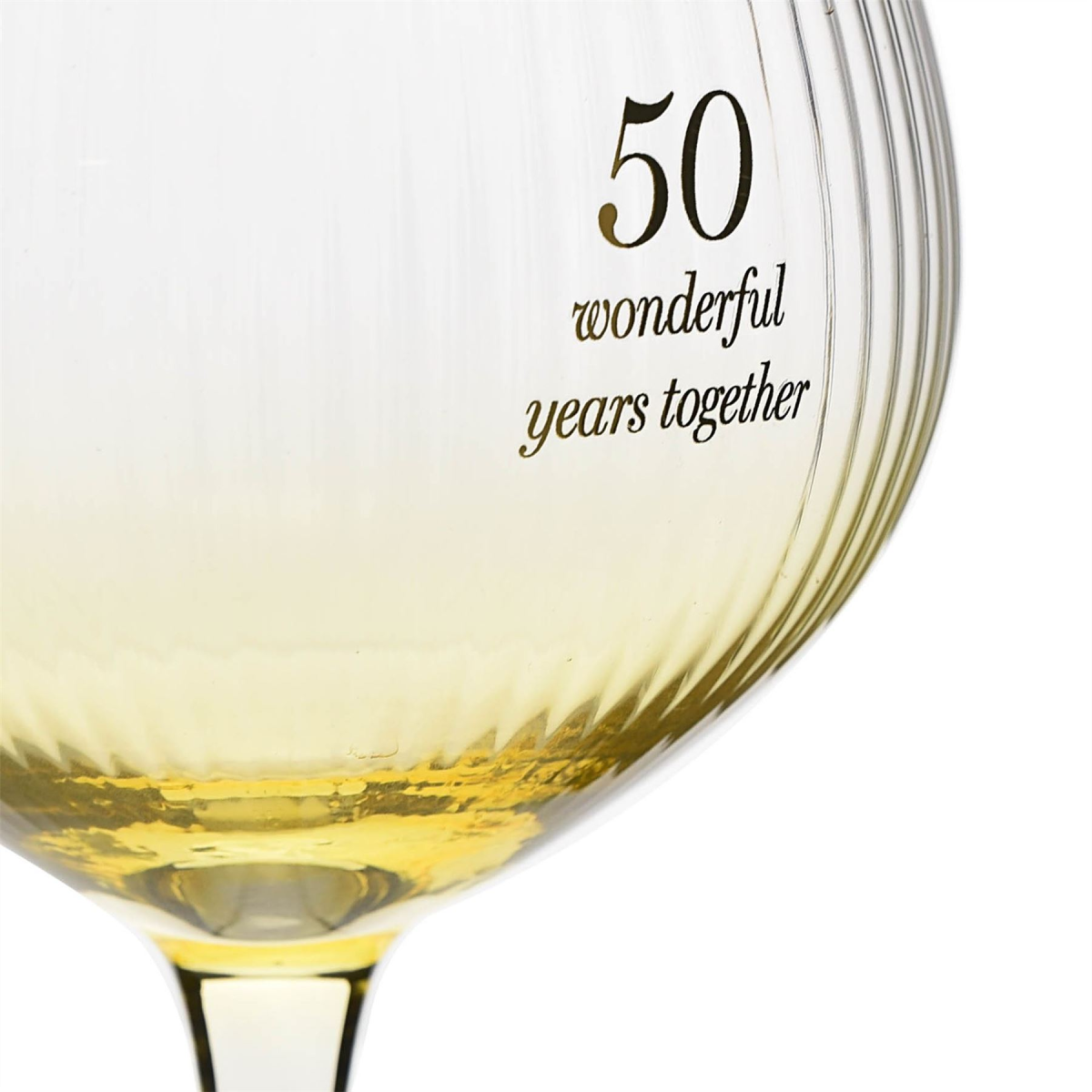 The large, rounded, golden yellow tinted glasses feature beautifully rippled effect glass which accentuates their long stem. The glasses are finished with an elegant �50 Wonderful Years Together� decal, complete with golden rim, making them a thoughtful gift for couples celebrating four decades of marriage or togetherness.