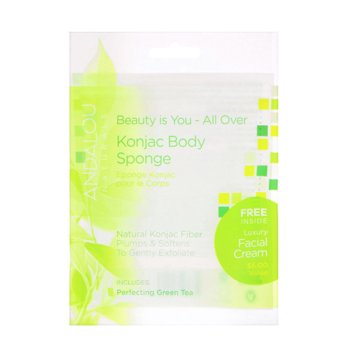 Fruit Stem Cell Science 100% All Natural Fiber Plumps & Softens to Gently Exfoliate Includes Body Sponge Perfecting Green Tea 100% Non-GMO Beauty Vegan and Cruelty Free Non-GMO Project Verified Verified Gluten Free Travel Friendly Konjac Sponge Duo First popular in Japan, these amazing Konjac Facial Sponges plump and soften to deliver extra gentle exfoliation and skin-friendly nutrients for a fresh, healthy complexion that glows. Features and Benefits: Skin cleansing sponges that gently exfoliate when wet. Extra soft for delicate skin and perfect for all skin types. Removes dull, dry surface cells that can dull complexion. Cleanses and refines pores, softens and conditions. Skin feels soft, smooth, and healthy with a natural glow.