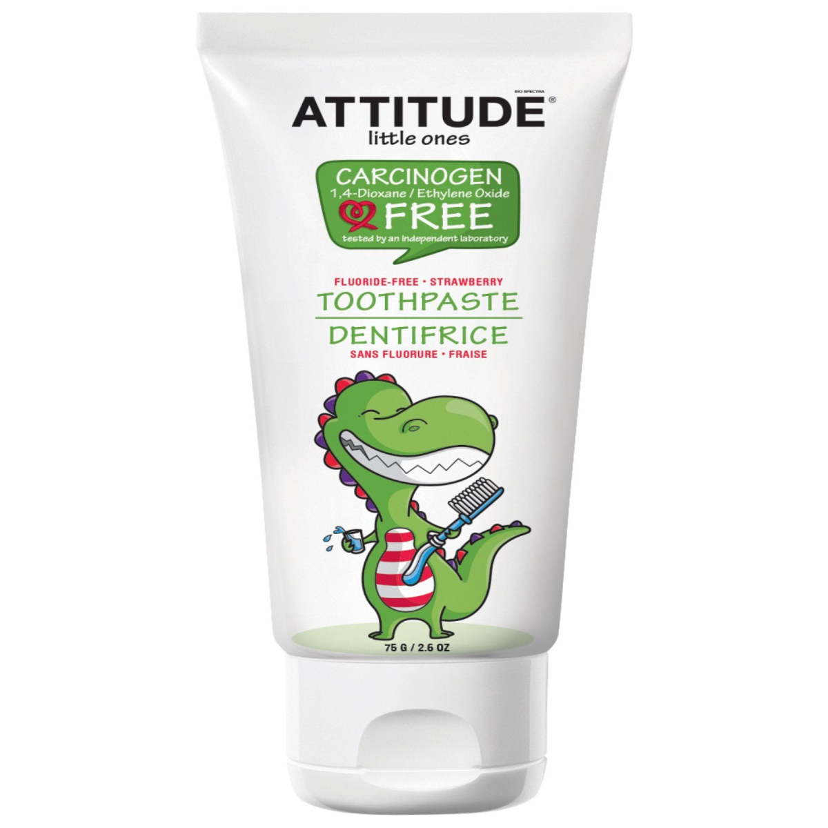 Carcinogen 1, 4-Dioxane-Ethylene Oxide Free Tested by an Independent Laboratory Vegan Product EcoFriendly Ecologo Natural and fluoride-free, Attitude's training toothpaste is perfect for introducing your child to the lifelong practice of healthy dental habits. 1, 4-Dioxane and ethylene oxide may be found as legally tolerated contaminants in personal care products. This Attitude product does not contain these by-products listed as carcinogenic to humans by the International Agency for research on cancer (group 1 or 2). CO2 neutral: Attitude is manufactured using 100% renewable energy and we plan trees to compensate for our inevitable greenhouse gas emissions. This is how we contribute to the fight against climate change.