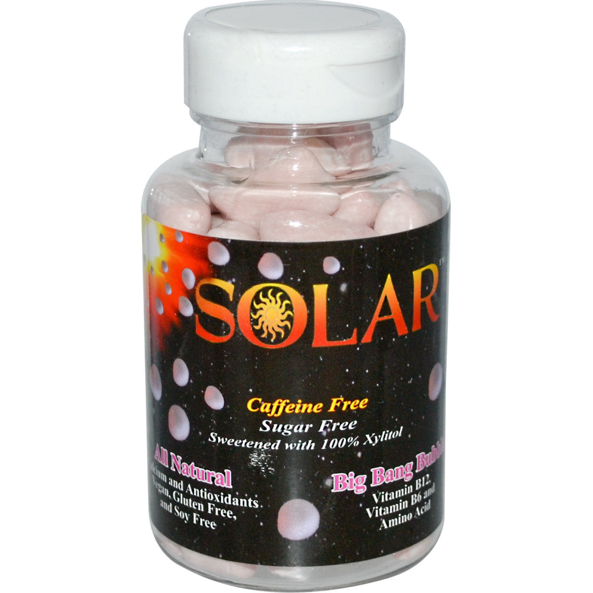 Caffeine Free Sugar Free Sweetened with 100% Xylitol All Natural Calcium and Antioxidants Vegan, Gluten Free and Soy Free Vitamin B12, Vitamin B6 and Amino Acid 300% RDI Vitamin B12 Kosher GMO Free "There is No Substitute for Quality" Our patented product (U.S. Pat 6,083,527), Solar Energy Gum is dramatically different from other energy products. All the ingredients found in Solar are 100% natural and are easily dissolved in the saliva and absorbed in the mouth. This process, known as oral absorption, allows essential B12 antioxidants and vitamins to be delivered directly into the bloodstream, resulting in an exhilarating boost of energy. The formulation of this unique Energy Gum naturally alters the pH levels in your mouth and fights bacteria that cause tooth decay, plaque, and bad breath. Solar Energy Gum contains two types of Water Soluble Calcium and vitamin B12. The patented combination of calcium and B12 helps energize the body's immune system, fights free radicals, and contributes to numerous other health benefits.