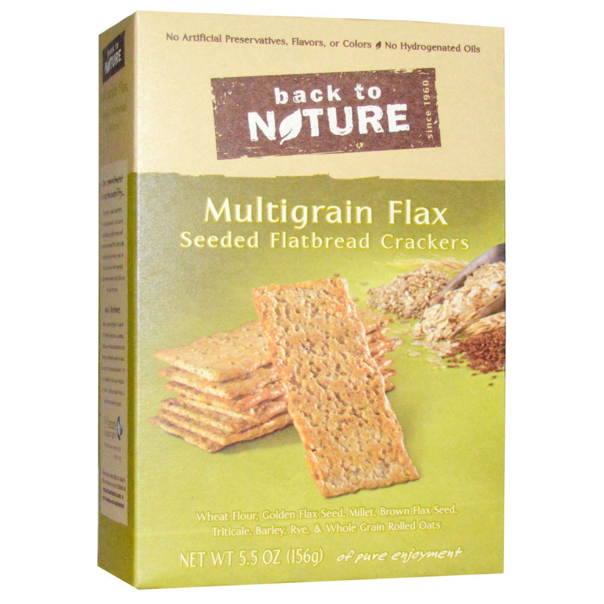 No Artificial Preservatives, Flavors, or Colors No Hydrogenated Oils Since 1960 Wheat Flour, Golden Flax Seed, Millet, Brown Flax Seed Triticale, Barley, Rye, & Whole Grain Rolled Oats Of Pure Enjoyment Simple Ingredients. Simply Delicious. Simply Good For over 50 years, Back to Nature has passionately created food with wholesome grains, real nutrition, and the delicious flavors of nature free from artificial ingredients, We give people truly flavorful, wholesome foods made with simple ingredients. Here's the Great Stuff about Multigrain Flax Seeded Flatbread Crackers Our crunchy Multigrain Flax Seeded Flatbread Crackers are delicious and offer the nutty flavor of flax seed combined with savory seasonings. These flatbreads will help make your next snacking experience unforgettable.