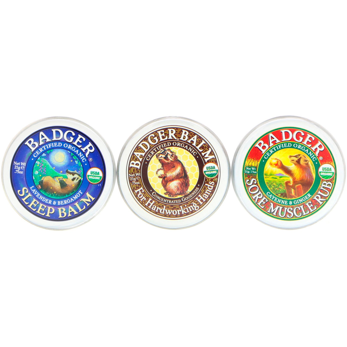 USDA This Stuff Works. Rub It In. Powerfully Pure Body Care Cruelty Free Certified B Corporation Certified by NH Dept. of Agr., Mkts., & Food Badger Blends are made from powerfully pure combinations of fresh, whole botanicals brimming with "life force". No synthetics, parabens, GMOs, harsh chemicals or any other nasty stuff- ever! These popular balms are custom formulated and carefully prepared to soothe, refresh, and restore mind, body, and spirit naturally. Certified and 100% natural ingredients, with a soothing base of Extra Virgin Olive Oil and Beeswax. Set Contains: Certified Badger Balm For Hardworking Hands Certified Badger Sore Muscle Rub - Cayenne & Ginger Certified Badger Sleep Balm - Lavender & Bergamot Badger Balm For Hardworking Hands USDA Soothes and Softens Rough, Dry Hands and Skin Try It - Rub It In - This Stuff Works Certified by NH Dept. of Agr. Mkts., & Food Badger Sore Muscle Rub USDA Original Blend You Deserve It - Soothing Warmth - Rub It In Certified by NH Dept. of Agr., Mkts., & Food Badger Sleep Balm USDA Rest - Eyes - Mind Calms, Soothes, and Relaxes the Senses Certified by NH Dept. of Agr. Mkts., & Food Suggested Use: Badger Balm For Hardworking Hands - Apply as needed. Badger Sore Muscle Rub - Use to soothe the every aches and pains from exercise and hard work. Rub it in. Badger Sleep Balm - Apply to pulse points and breath deeply.