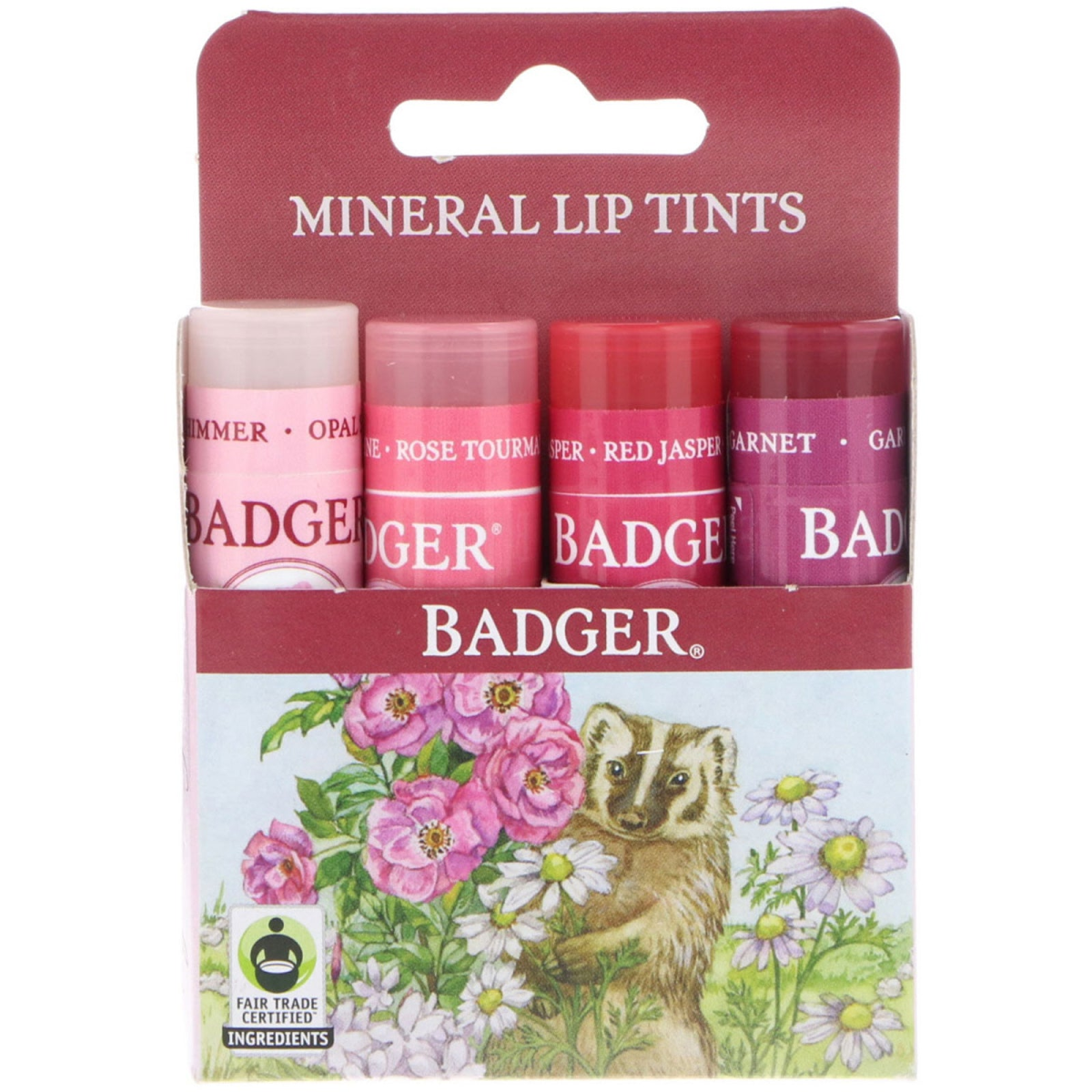 Rose and Vanilla 21% Fair Trade Certified Ingredients A Little Magic For Your Lips Healthy Body Care Certified B Corporation Leaping Bunny Cruelty Free Certified by NSF to NSF Non-GMO True North Fair Trade Certified by Fair Trade USA Contains: Opal Shimmer, .15 oz (4.2 g) Rose Tourmaline, .15 oz (4.2 g) Red Jasper, .15 oz (4.2 g) Garnet, .15 oz (4.2 g) Badger Mineral Lip Tints protect and nourish, leaving lips soft and naturally beautiful. With the delicate fragrance of Rose and Vanilla organic essential oils. Opal Shimmer Keep it simple and natural. Creamy and smooth with just the right amount of sparkle, our Opal Shimmer natural mineral lip tint protects and nourishes, leaving your lips soft and beautiful. Wear it alone for a subtle hint of shine, or over your favorite lip tint to play up the color. Subtle aroma of Rose and Vanilla plus the naturally heavenly scent of Shea and Cocoa Butter will make it your new go-to everyday lip balm. Rose Tourmaline Slightly pink. Simply gorgeous. Creamy and smooth with a delicate rose-pink hue, our Rose Tourmaline natural mineral lip tint protects and nourishes, leaving your lips soft and beautiful. One swipe delivers a sheer touch of color, or apply liberally for increased intensity. Great in a pinch for adding a bit of color to your cheeks and under the brow bone. Subtle aroma of Rose and Vanilla plus the naturally heavenly scent of Shea and Cocoa Butter will make it your new go-to everyday lip balm. Red Jasper A hint of color. A lot of gorgeous, creamy and smooth with a delicate fire-red hue, Red Jasper natural mineral lip tint protects and nourishes, leaving lips soft and beautiful. One swipe delivers a sheer touch of color, or apply liberally for increased intensity. Great in a pinch for adding a bit of color to your cheeks and under the brow bone. Subtle aroma of Rose and Vanilla plus the naturally heavenly scent of Shea and Cocoa Butter will make it your new go-to everyday lip balm. Garnet Pleasingly plum. Utterly gorgeous. Creamy and smooth with a subtle plum-red hue, our Garnet natural mineral lip tint protects and nourishes, leaving your lips soft and beautiful. One swipe delivers a sheer touch of color, or apply liberally for increased intensity. Great in a pinch for adding a bit of color to your cheeks and under the brow bone. Subtle aroma of Rose and Vanilla plus the naturally heavenly scent of Shea and Cocoa Butter will make it your new go-to everyday lip balm.