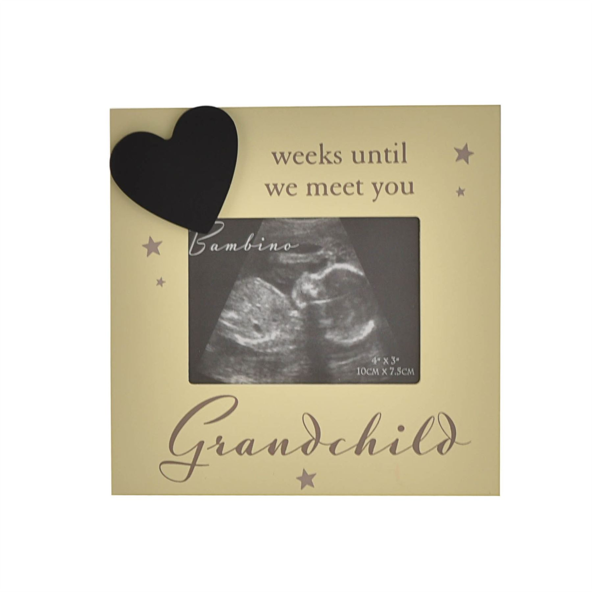 The freestanding, ivory resin frame features a rectangular aperture designed specifically for baby scan photos, complete with pastel grey star decoration. It is finished with a heart-shaped chalkboard and �Weeks Until We Meet You � Grandchild� decal which is designed to be used for countdown to birth.