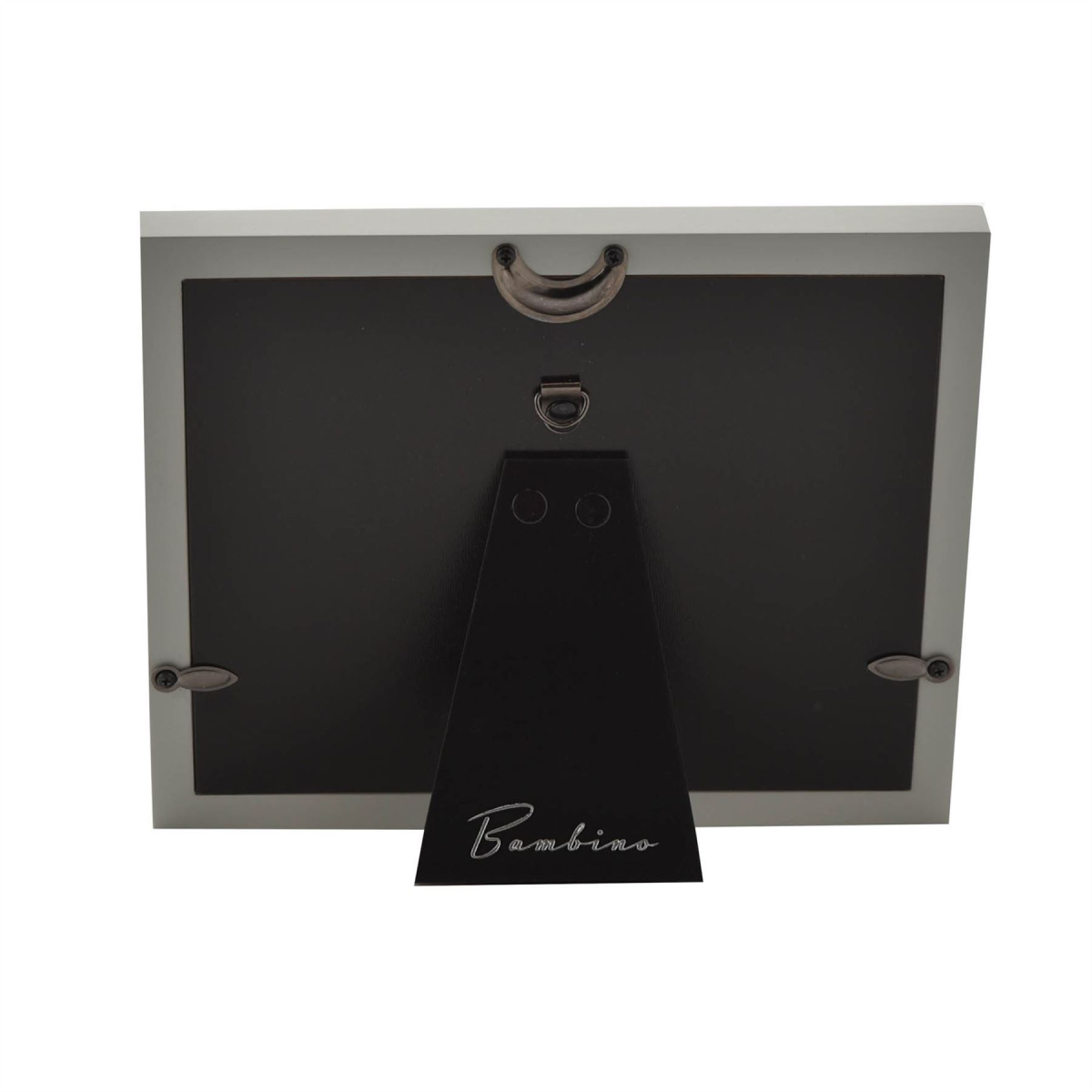 The wooden frame has a matt grey finish, enhanced by a large white mount, complete with �Daddy & Me� silver foil embossed decal and landscape aperture. The frame is designed for either freestanding display or wall hanging.