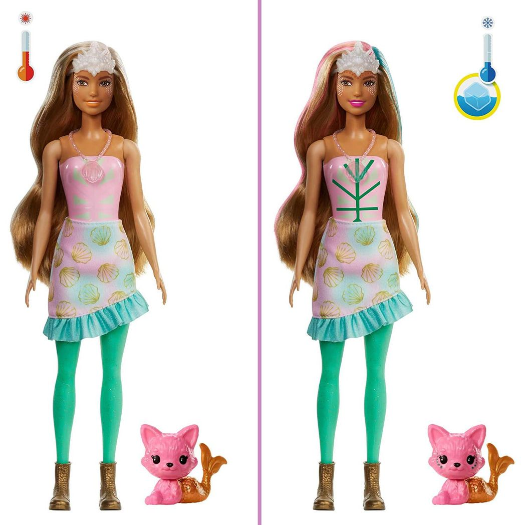 Barbie Colour Reveal dolls deliver the ultimate unboxing experience -- this set features 25 surprises, including 4 repeat colour-change features, a 'mer-pet,' two fantasy fashion mermaid outfits, glitter and slime in a heart-shaped compact, a Barbie doll, a child-sized charm bracelet with two charms and a sticker! Play out fantasy fashion transformations over and over again. The packaging is part of the fun, too -- remove the 16 mystery bags through the peel-able front panels. One of the surprise bags contains a mystery Colour Reveal doll partially covered in purple peelable coating. Kids peel to reveal the doll, then open the surprise bags to discover clothes and accessories for two complete mermaid-inspired looks! And the surprises continue to peel to reveal the 'mer-pet,' too! Dip the seashell-shaped sponge in ice-cold water to activate the colour-change features -- like on the doll's face, bodice and hair! Colour change on the pet's face adds to the surprise fun! With the use of warm and ice-cold water, kids can repeat the wow colour-change moments over and over again! With so many surprises and pieces, kids will have so many stories to tell. Which doll will you reveal? Kids can collect them to mix and match accessories and expand the storytelling possibilities! Each is sold separately, subject to availability. Doll cannot stand alone. Colours and decorations may vary.