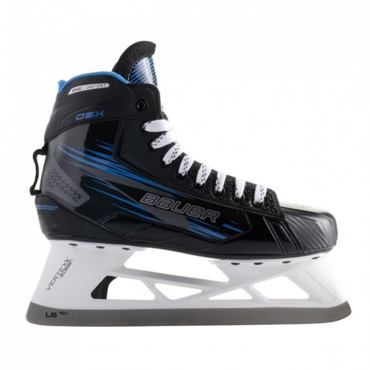 Bauer GSX '24 Intermediate Goalkeeper Skates Get comfortable while you play! These skates are designed with a traditional boot style in mind, offering a softer stiffness and a deeper fit. These skates are the perfect choice for beginners and amateur goalkeepers. They provide comfort and functionality on the ice. Key Features Features: Boot Quarter: Fiber composite with Stanceflex technology. Allows for greater forward flexibility, features a soft lining for greater comfort. Lightweight TPU outsole: Reduced weight on the feet allows for faster movement around the goal, increasing efficiency and reaction speed. VERTEXX Blade: First featured on the youth version of the GSX Goal Skate, this distinctive blade promotes the preferred angle of attack and approach of goalkeepers and allows for quick blade changes. LS1G Blade: Strong, lightweight, built to withstand every push and kick, providing durability and reliability during play. The Bauer GSX '24 Int goalie skates are a great choice for goalies of all levels. Ideal for those who are just starting out in hockey or playing recreationally. With innovative solutions such as the STANCEFLEX Quarter, lightweight TPU sole and VERTEXX blade, these skates provide exceptional comfort, mobility and durability. TECHNICAL SPECIFICATIONS Intended use Hockey, Intermediate goalie Blade and blade Vertexx Edge, LS1G+ Material Fiber composite with Stanceflex technology Tongue Felt Blade replacement option in the EDGE system Yes Thermoforming Yes Lining Microfiber, Memory Foam