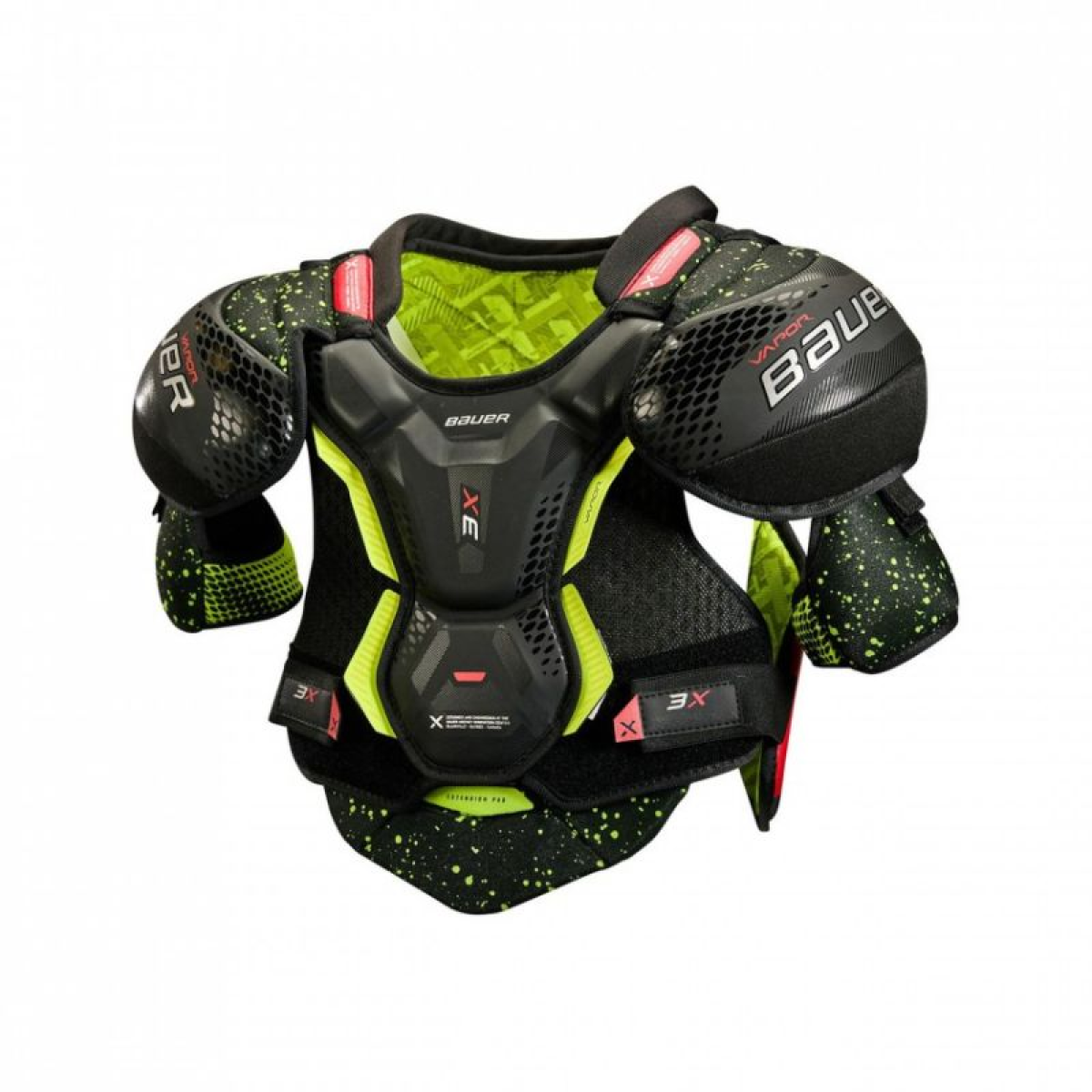 Bauer Vapor 3X Junior Hockey Shoulder Pads Level: Competitive Key Upgrades: Integrated molded sternum, Low-profile shoulder guard Shoulder Protection: Low-profile shoulder guard Sternum Guard: Integrated molded sternum Front Panel: Ventilated and flexible flexaprene vest Spine: Integrated spine with PE insert Back Panel : Ventilated and flexible flexaprene vest with rib insert Collarbone protection: Segmented with PE insert Bicep: Adjustable bicep with molded PE Padding: Thermomax