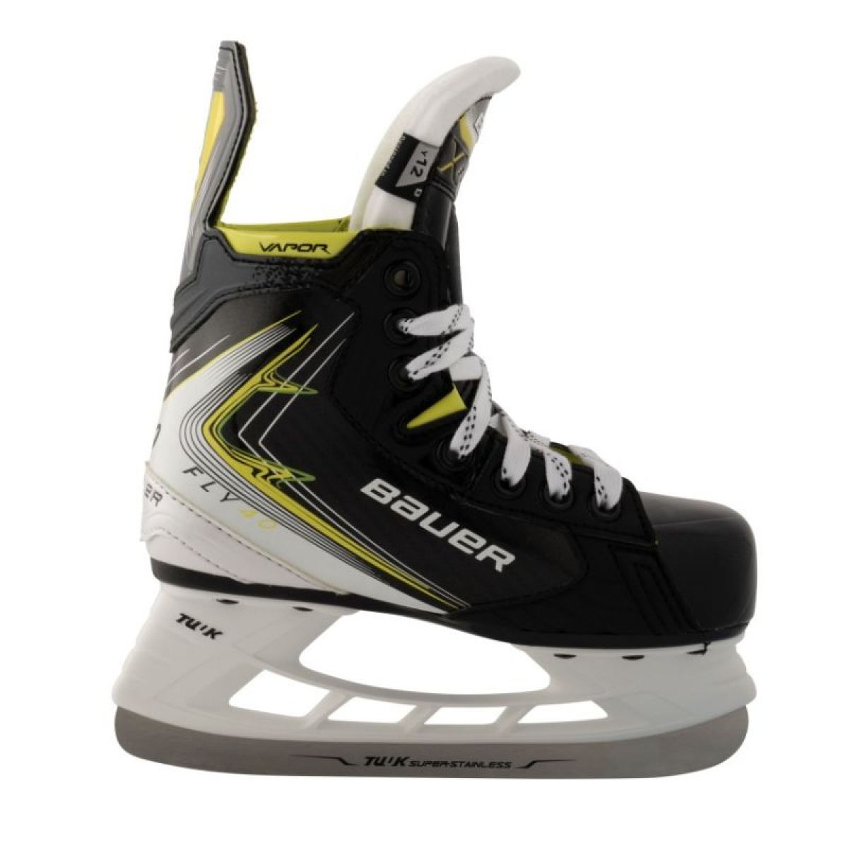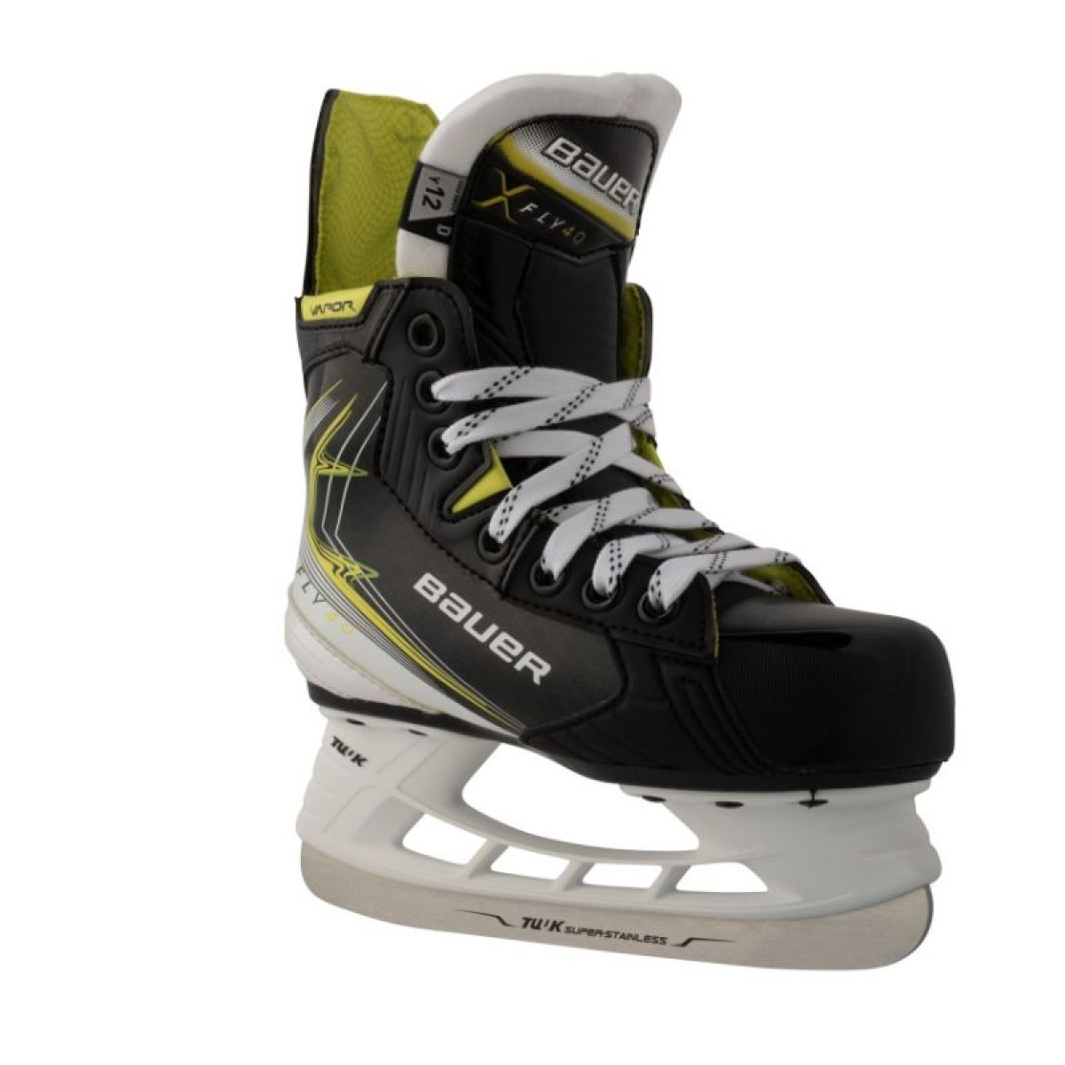 Bauer Vapor Fly40 Youth Hockey Skates: A First Step to the Big Game. Perfect for the youngest players just starting out in hockey, the Bauer VAPOR FLY40 Youth are designed to make every practice and match comfortable, easy, and full of fun. Thanks to flexible materials and a youth-specific design, kids can develop their skills with confidence and a smile on their faces. Key Features: Find Your Rhythm: The child-specific DIGI COMP boot construction combined with MOTIONFLEX technology supports learning the correct skating stride. Your child gains ease of forward bending while maintaining lateral stability—the perfect combination for young players. Designed to Shine: Colorful, eye-catching graphics inspired by the top-of-the-line FLYLITE skates will make your child stand out on the ice and proud to put on their skates before every game. Comfort from the First Time: A soft 30-ounce felt tongue and a soft upper construction ensure comfort with every step. Less distractions, more smiles, and more freedom on the ice. The Bauer VAPOR FLY40 Youth is the perfect starter skate – a combination of comfort, flexibility, and an attractive design that will motivate youngsters to fall in love with hockey from the very first game. TECHNICAL SPECIFICATIONS: Intended Use: Hockey, Field Player, Indoor Player. Blades: S. STAINLESS. Material: Lightweight DIGI COMP composite. Tongue: Pro-stock, 30-ounce felt. Blades replaceable with the EDGE system. No. Thermoformable. Yes. Lining: Sublimated with Comfort Edge finish.