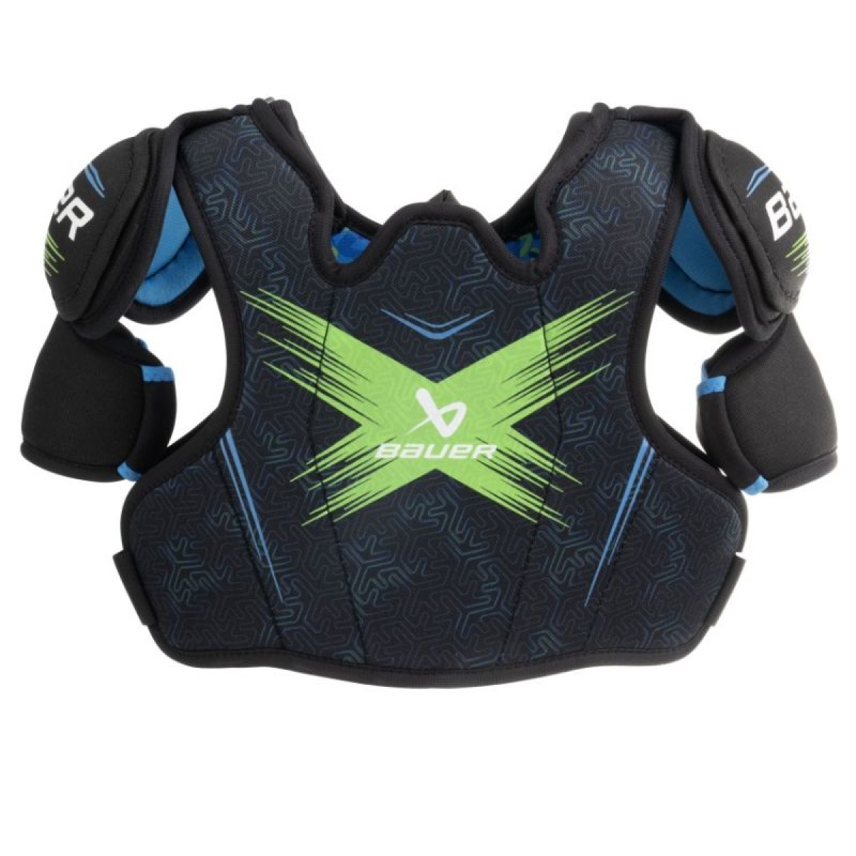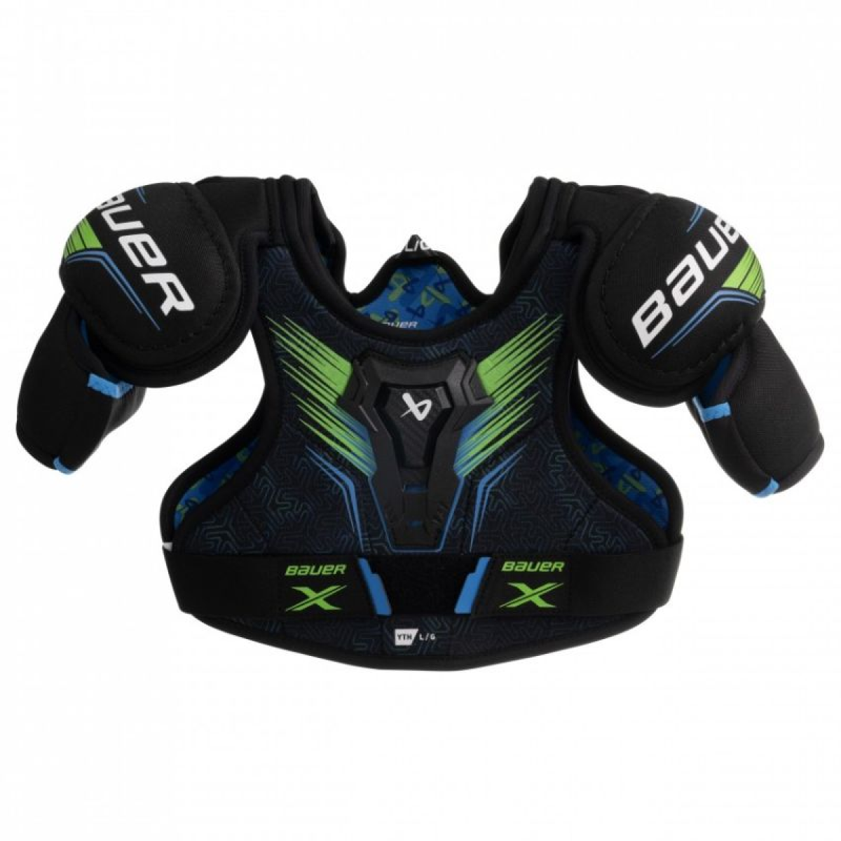 Bauer X '24 Kids' Hockey Shoulder Pads are designed for amateur players who value both protection and agility on the ice. With an updated bridge and advanced construction, these shoulder pads provide optimal protection without restricting freedom of movement. Key Features: Molded Bridge: Designed to protect against impacts while providing agility and lightweight comfort. Ideal for players who need solid protection without sacrificing mobility. FlexCell Foam: High-quality FlexCell foam provides added comfort and protection by adapting to the player's natural movements. Adjustable Bicep: Equipped with a convenient adjustment system, the sleeve can be easily adjusted to the player's individual needs, ensuring a perfect fit and bicep protection. Sublimated Base and Lining: Guarantees durability and a clean look while offering comfort during long training sessions and matches. The Bauer X '24 Youth Hockey Shoulder Pads are the perfect choice for hockey players who want to combine protection with complete freedom of movement on the ice. Featuring a molded sternum, FlexCell foam, and adjustable biceps, these shoulder pads offer not only advanced protection but also the comfort and flexibility needed to perform at their best. TECHNICAL SPECIFICATIONS: Designed for: Ice Hockey, Field Player, Youth. Shoulders: Low-profile shoulder pad with full coverage. Sternum: Molded sternum for impact protection. Front Panels: Comfort FlexCell foam with sublimated graphics. Spine: MD foam with PE insert. Back Panels: Sublimated hydrophobic. Arch: Low-profile with PE insert. Biceps: Adjustable bicep pad with comfort sleeve. Lining: Sublimated hydrophobic mesh.