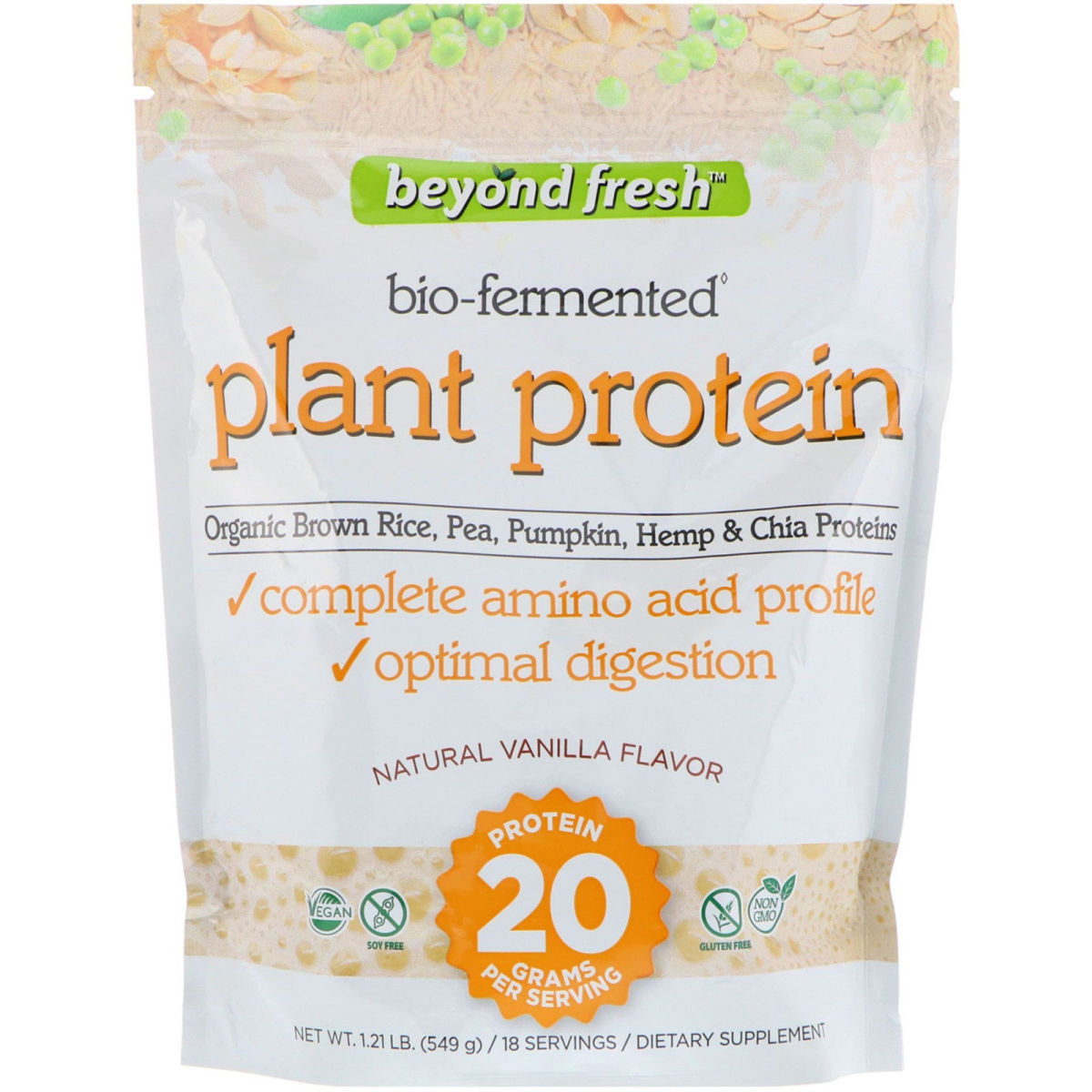 Bio-Fermented♦ Organic Brown Rice, Pea, Pumpkin, Hemp & Chia Proteins Complete Amino Acid Profile Optimal Digestion Protein - 20 Grams Per Serving Vegan Soy Free Gluten Free Non GMO 18 Servings Dietary Supplement Lactose Free Certified Organic by QAI Beyond Fresh quality natural supplements are in many ways superior to buying fresh fruits, vegetables and superfoods. The finest farm-fresh produce that's picked and harvested at the peak of ripeness, flavor and nutrient density. Advanced proprietary technologies lock in all of the valuable vitamins, minerals, phytonutrients and enzymes. Exceptional convenience and year-round accessibility that traditional "juicing" just can't offer. Beyond Fresh is the complete do-it yourself superfoods smoothie system that's better than fresh! Plant Protein - Natural, non-GMO Plant Protein provides an exceptional amino acid profile for health, performance and muscle building power. Beyond Fresh contains 20 grams of bio-fermented whole grain brown rice protein, pea protein, pumpkin protein, hemp protein and chia protein for greatest health and fitness benefits. Its alkaline base helps reduce acidity for better digestion and increased protein absorption. Bio-Fermented♦ - Fermentation is a natural process that helps boost digestion and allows for maximum absorption of amino acids. Fermentation also increases the production of important antioxidants that are more powerful and better absorbed than their unfermented counterparts. Beyond Fresh Plant Protein is Bio-Fermented for maximum amino acid saturation and assimilation. ♦Beyond Fresh brown rice protein is Sprouted Brown Rice Protein, 80% of which was enzymatically processed. An amylase enzyme is used to separate starch from protein. The enzyme is from bacterial origin.