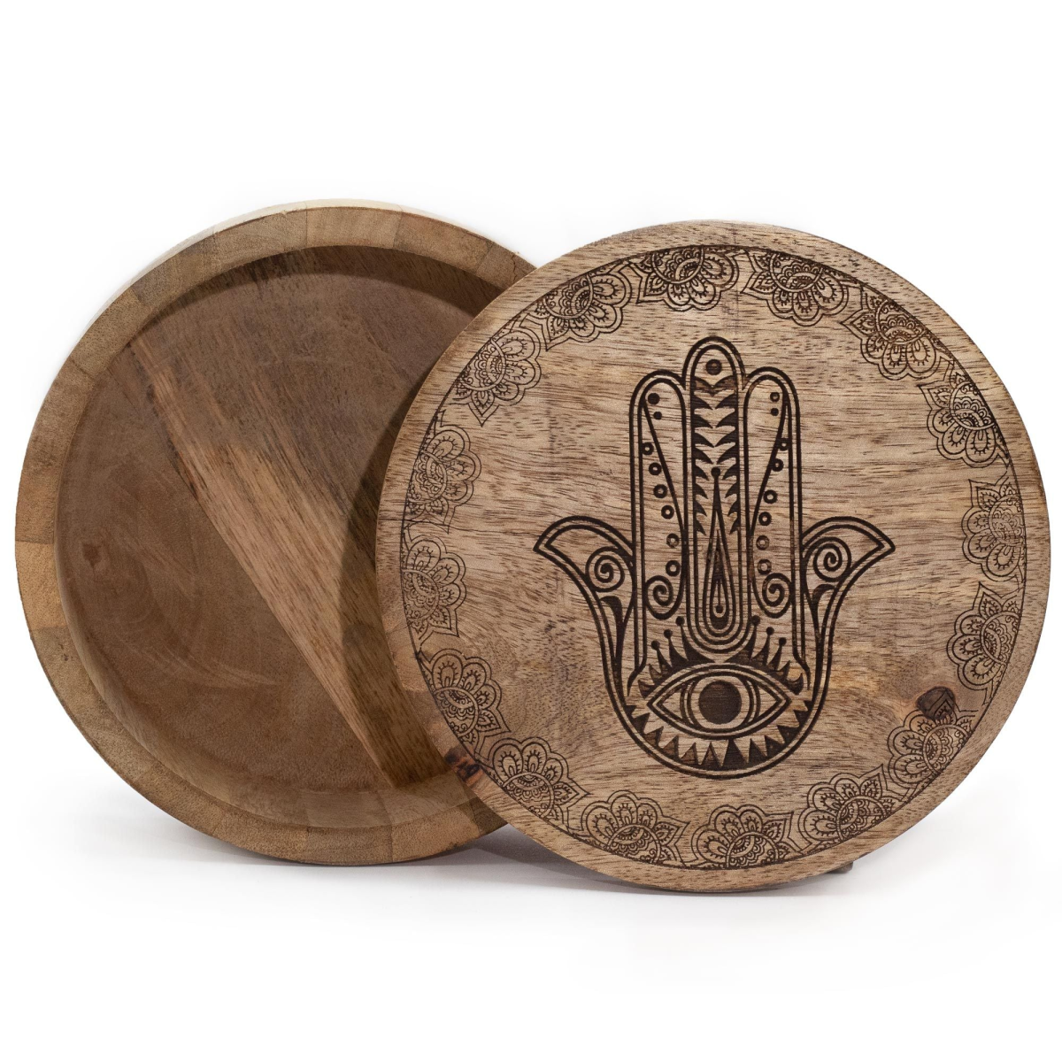 Crafted from mango wood, the Big Round Box 17.5x7.5cm features a finely engraved black Hamsa design. With a net weight of 618 g, this sturdy box combines both functional storage and aesthetic appeal. Its compact dimensions make it suitable for organizing small items while adding a distinctive decorative touch. Produced in India, it reflects careful craftsmanship and natural materials.