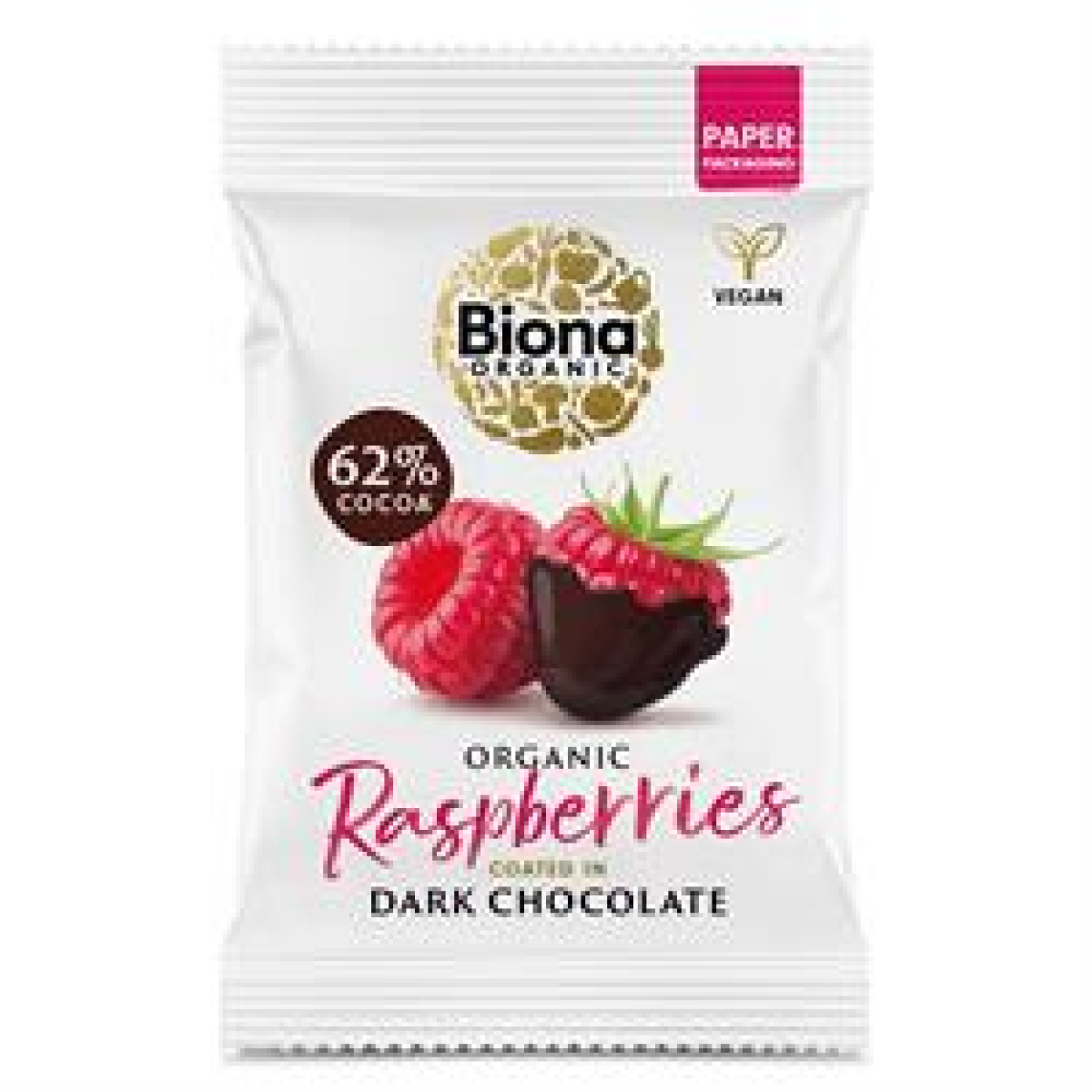 Biona Organic Dark Chocolate Raspberries. Whole freeze-dried raspberries enveloped in layers of organic dark chocolate. A vibrant, fruity twist on classic chocolate snacks - plant-based, gluten-free and made with fair trade cocoa.
