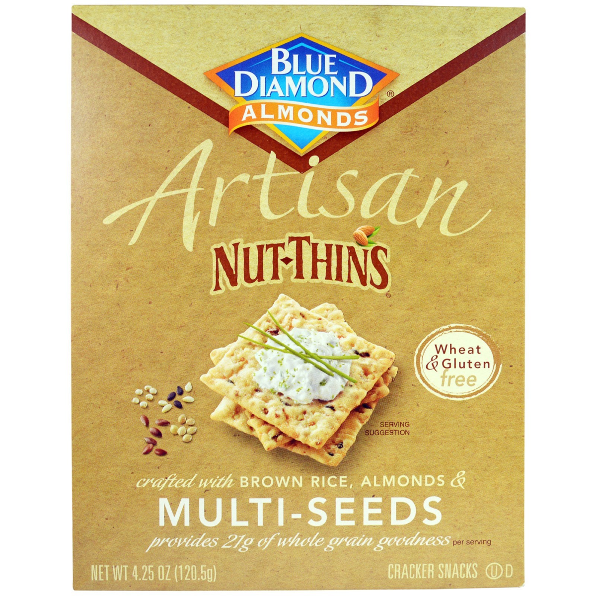 Wheat & Gluten Free Crafted With Brown Rice and Almonds Provides 21 g of Whole Grain Goodness per Serving Certified Gluten-Free The Delicious Gluten-Free Artisan Cracker We think you'll agree these artisan-baked crackers go well with almost everything. Now you can enjoy the delicious taste of Blue Diamond Artisan Nut-Thins with the added tasty benefits of Multi-Seeds. We're sure they'll be your new favorite, guilt-free snack! Tasty Benefits per Serving 3 g of Protein 21 g of Whole Grain 130 Calories for 13 Crackers No Wheat or Gluten