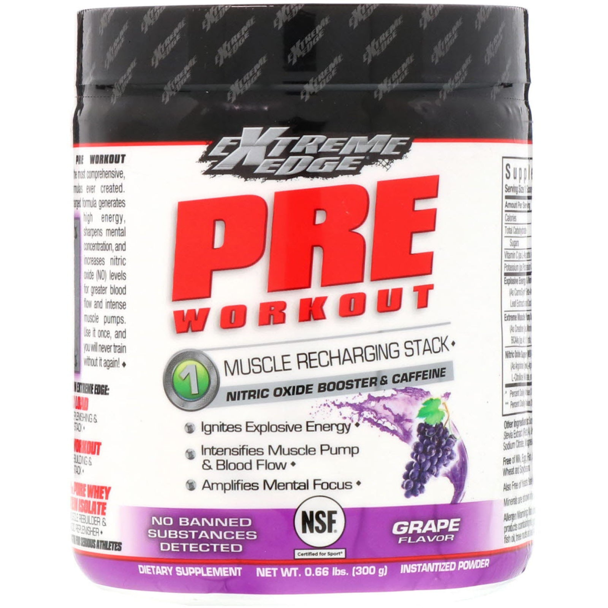 Nitric Oxide Booster & Caffeine Ignites Explosive Energy Intensifies Muscle Pump & Blood Flow Amplifies Mental Focus No Banned Substances Detected NSF Certified for Sport - Tested · Certified · Safer Dietary Supplement Instantized Powder CarnoSyn - Carnosine Synthesizer AjiPure Amino Acids Product Tested for 200+ Banned Substances Product Checked Against Sports Prohibitive Lists (NFL, MLB) Professional Strength for Serious Athletes Key Features Provides three unique ingredient stacks for explosive energy. Free of artificially-derived colors, flavors and sweeteners. Natural sources of caffeine (e.g., green tea and cocoa extracts). Extreme Edge Pre Workout is designed to be one of the most comprehensive, muscle recharging formulas ever created. This triple-turbo, super-charged formula generates high energy, sharpens mental concentration, and increases nitric oxide (NO) levels for greater blood flow and intense muscle pumps. Use it once, and you will never train without it again!