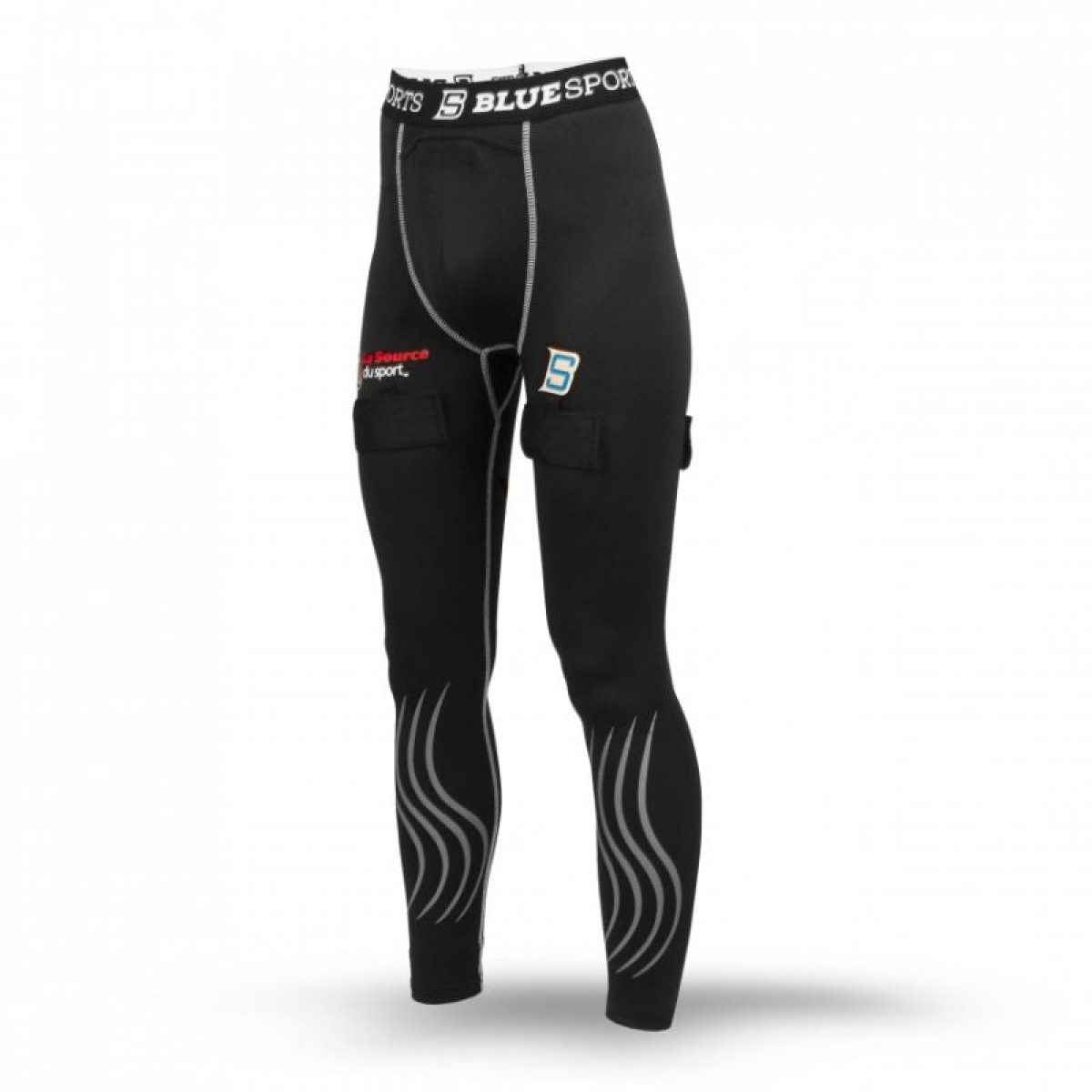 BlueSports '22 Jr Compression Pants with Velcro Cups. Made with moisture-wicking fabric, they feature silicone inserts on the shins to help keep shin guards snug and secure over hockey socks. They also include a hard-shell cup for maximum protection and comfort in the groin area.