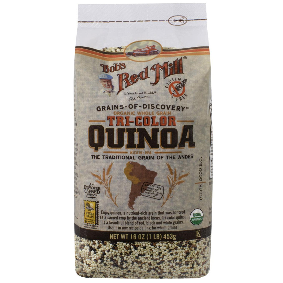 To Your Good Health - Bob Moore Gluten Free Grains-of-Discovery Whole Grain The Traditional Grain of the Andes Circa | 2000 B.C. Bob's Red Mill Passport to Whole Grain Adventure 100% Whole Grain - 48 g or More Per Serving Eat 48 g or More of Whole Grains Daily USDA Kosher Certified by QAI Enjoy Quinoa, a nutrient-rich grain that was honored as a sacred crop by the ancient Incas. Tri-color quinoa is a beautiful blend of red, black and white grains. Use it in any recipe calling for whole grains. Native to South America, quinoa is a "pseudo-grain"—actually a gluten-free seed, but used in cooking like a whole grain. This amazing plant was domesticated thousands of years ago near Lake Titicaca, high on the plateaus of the Andes, and it was a mainstay in the diet of the ancient Incas. Tri-color quinoa is delicious on its own and in pilafs, soups and salads; the beautiful color elevates even the simplest dish. Our tri-color quinoa has been thoroughly rinsed and air dried to remove the naturally occurring bitter saponins. Bob's Red Mill products labeled Gluten Free are batch tested in our quality control laboratory. We use an ELISA Gluten Assay test to confirm that a product is gluten free. Our product line is diverse and extensive. Dear Friends, There's a saying, "What once was old is new again." This expression certainly applies to our tradition stone grinding mills, which are much like the ones used in early Roman times. It's also true about many of our favorite whole grains, which originated in ancient times. Amaranth, chia seed, farro, Kamut grain, millet, quinoa, sorghum, spelt and teff—they may be lesser-known than the familiar grains like wheat and barley, but each one has a story to tell, with histories going back thousands of years and rich cultural traditions from around the globe. Lucky for us, these whole grains aren't just ancient history; they're also tasty, nutritious additions to modern meals. These "super grains" of the ancient world are wonderfully healthy, and their unique flavors and textures will add a delicious twist to your favorite recipes. They're versatile, too—great for snacks, salads, side dishes, entrees and baked goods. At Bob's Red Mill, we're always exploring the world in search of new whole grain adventures, and we're proud to mill the widest possible diversity of whole grain foods. With that in mind, we invite you to join us in discovering these grains of antiquity. To your good health, Bob Moore