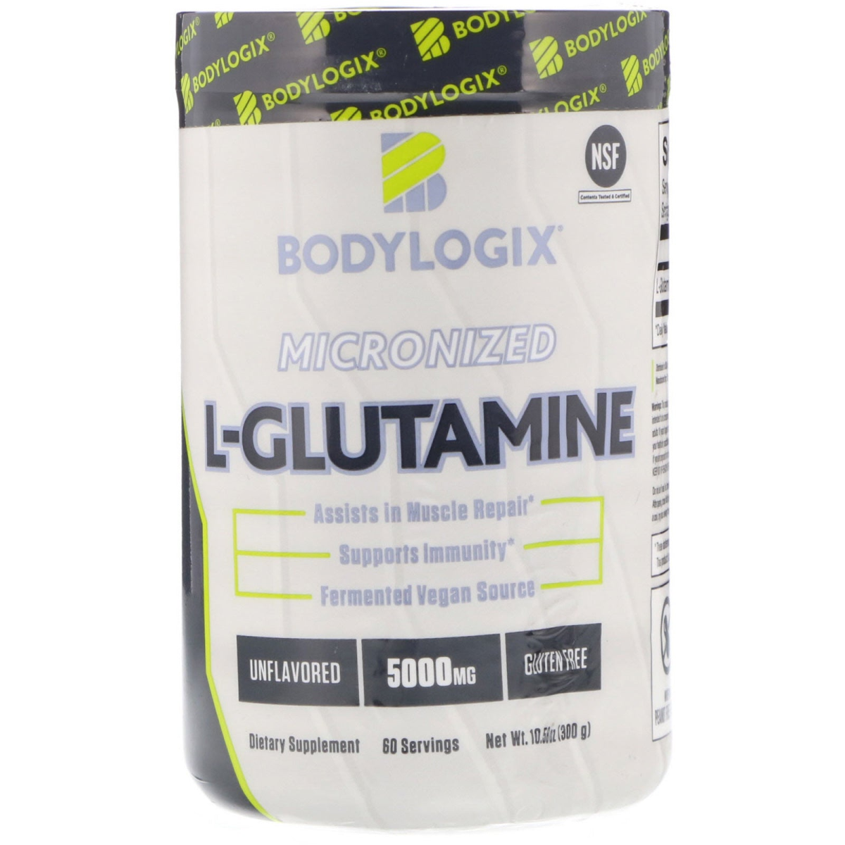 NSF-Contents Tested & Certified Assists in Muscle Repair Supports Immunity Fermented Vegan Source Gluten-Free Dietary Supplement 60 Servings The Bodylogix L-Glutamine Advantage No Fillers No Additives No Excipients Because trust is of the utmost importance, our production facility is GMP registered and our products are certified by NSF, a world leader in third-party testing to ensure the highest quality standards. With clinically studied ingredients, our products are designed to help you get the most out of your workout. With performance driven nutrition, you can count on us to support your active lifestyle. Clean. Trust. Performance. Bodylogix L-Glutamine delivers 5000 mg of non-GMO, pure micronized L-Glutamine, the most abundant free amino acid in skeletal muscle, known to support and help protect muscle tissue. A favorite of high performance athletes, Bodylogix L-Glutamine is micronized for improved solubility and rapid absorption.
