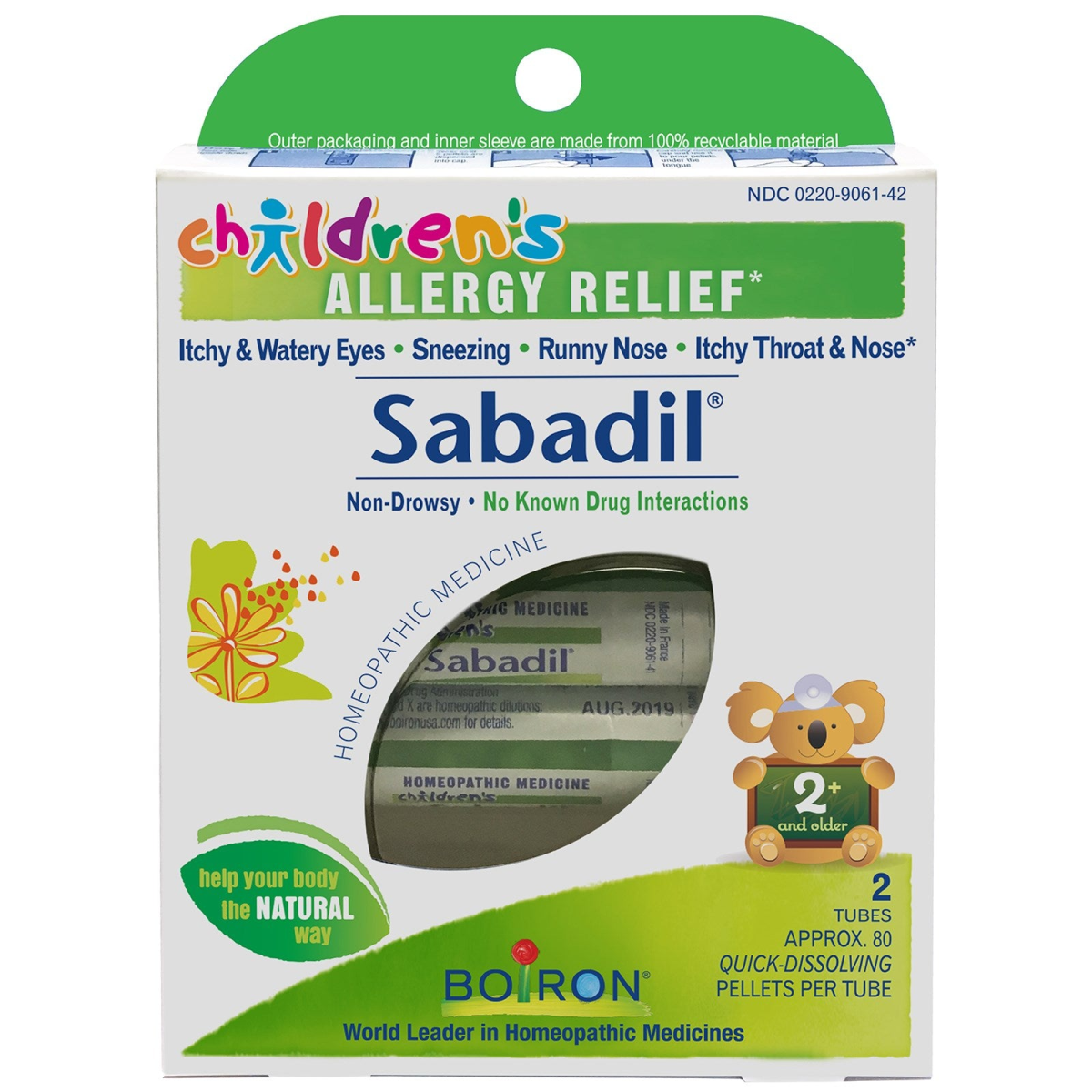 Itchy & Watery Eyes Sneezing Runny Nose Itchy Throat & Nose Non-Drowsy No Drug Interactions Homeopathic Medicine 2+ and Older Works Naturally with Your Body Quick-Dissolving World Leader in Homeopathic Medicines Take Sabadil at the First Sign of Allergy Symptoms Uses Temporarily relieves one or more of these symptoms of hay fever or other upper respiratory allergies: Itchy and water eyes Sneezing Runny Nose Itchy throat and nose