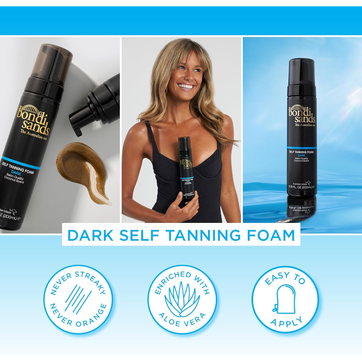 - ABOUT THE PRODUCT: The Bondi Sands Dark Self-Tanning Foam is a lightweight foam that's simple to apply and gives a flawless finish, every time. Enriched with Aloe Vera and infused with the scent of coconut, this salon-quality formula provides the ultimate natural bronzed glow. Our Dark Self-Tanning Foam is perfect for those with a darker complexion or those who prefer a darker glow. The compact 100 mL bottle is ideal for traveling.