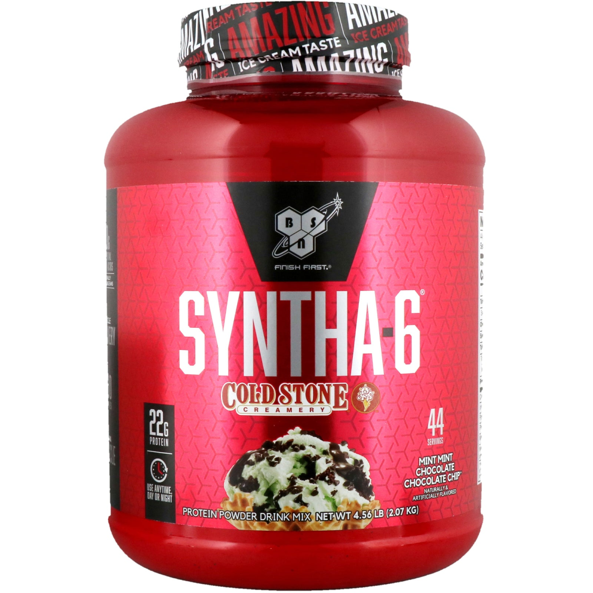 Amazing Ice Cream Taste Finish First 10 g Essential Amino Acids - Naturally Occurring EAAS Muscle Recovery 200 Calories Lean Muscle 22 g Protein Use Anytime, Day or Night Naturally & Artificially Flavored Protein Powder Drink Mix 44 Servings Ultra-Premium Protein. Ultra-Premium Taste It's hard to beat Syntha-6. Since 2004, nothing has matched the milkshake-like flavor and creamy texture–until now. Say Hello to Syntha-6 and Cold Stone Creamery Mint Mint Chocolate Chocolate Chip. A decadent combination of Mint, Chocolate Chip, Brownie and Fudge flavors mixed with real Cookie Bits–plus it's packed with ultra-premium BSN protein complex. We outdid ourselves, once again.