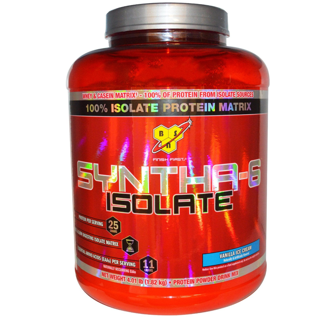 Whey & Casein Matrix - 100% of Protein from Isolate Sources 100% Isolate Protein Matrix Finish First Protein Per Serving 25 g Fast & Slow Digesting Isolate Matrix Essential Amino Acids (EAAs) Per Serving 11 g (Naturally Occurring EAAs) Naturally & Artificially Flavored Protein Powder Drink Mix The Next Evolution in Protein Isolates Syntha-6 Isolate Product Highlights: Isolast Isolate Protein Matrix - Consists of: Fast & slow release proteins Whey Protein Isolate Milk protein isolate (~80% casein & ~20% whey) Naturally occurring BCAAs and other essential and non-essential amino acids EFAs & fiber blend (inulin & polydextrose) Same great Syntha-6 milkshake taste and texture Designed For: Any individual who wants an ultra-premium protein powder to help them reach their nutritional and physique goals. Isolast is an exclusive proprietary isolate protein matrix developed by BSN. Lecithin is a phospholipid complex derived from soybean oil, which is used to promote mixability. This product has been manufactured by a Good Manufacturing Practices (GMP) facility.