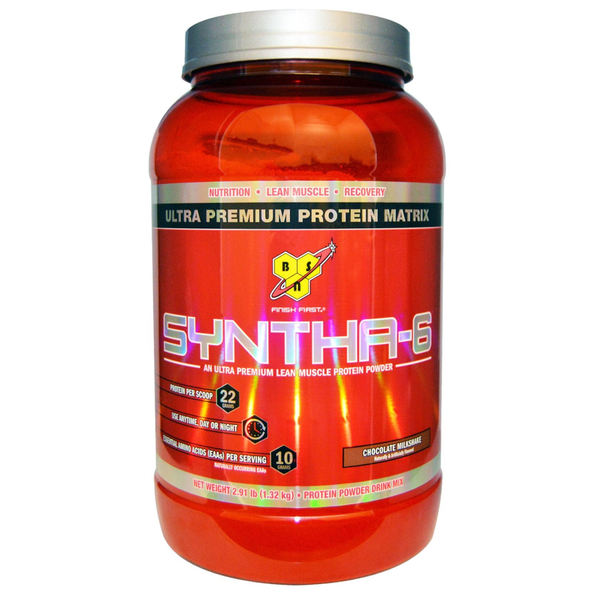 Nutrition Lean Muscle Recovery Ultra Premium Protein Matrix Finish First An Ultra Lean Muscle Protein Powder Protein Per Scoop - 22 Grams Use Anytime, Day or Night Essential Amino Acids (EAAs) Per Serving -10 Grams Naturally Occurring EAAs Naturally & Artificially Flavored Ultra-Premium Protein. Ultra-Premiun Taste. Syntha-6 Product Highlights: Multi-Functional Ultra-Premium Protein Matrix Naturally Occurring BCAAs and other Essential and Non-Essential Amino Acids MCTs, EFAs, and Glutamine Peptides Excellent Source of Fiber. Contains 6g of Fat per serving Zero Milligrams of Aspartame Designed For: Any individual who wants an ultra-premium protein powder to help them reach their nutritional and physique goals. Lecithin is a phospholipid complex derived from soybean oil, which is used to promote mixability. This product has been manufactured by a Good Manufacturing Practices (GMP) facility.