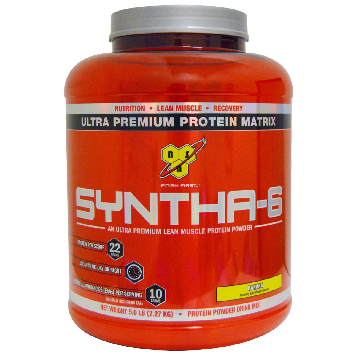 Nutrition Lean Muscle Recovery Finish First An Ultra Premium Lean Muscle Protein Powder Naturally & Artificially Flavored Protein Per Scoop - 22 Grams Use Anytime, Day or Night Essential Amino Acids (EAAs) Per Serving- 10 Grams Naturally Occurring EAAs Protein Powder Drink Mix Ultra-Premium Protein. Ultra-Premium Taste. Syntha-6 Product Highlights: Multi-Functional Ultra-Premium Protein Matrix Naturally Occurring BCAAs and other Essential and Non-Essential Amino Acids MCTs, EFAs, and Glutamine Peptides Excellent Source of Fiber. Contains 6 g of Fat per serving Zero Milligrams of Aspartame Designed For: Any individual who wants an ultra-premium protein powder to help them reach their nutritional and physique goals. Lecithin is a phospholipid complex derived from soybean oil, which is used to promote mixability. This product has been manufactured by a Good Manufacturing Practices (GMP) facility.
