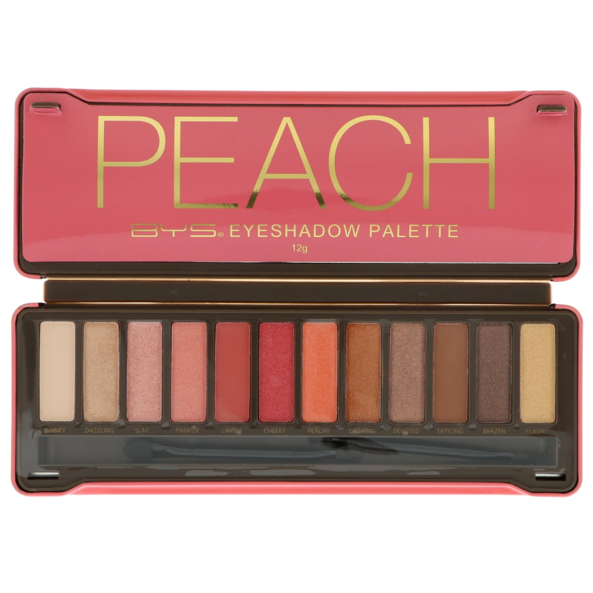 Cruelty Free Not Tested On Animals Colors Include: Dainty Dazzling Slay Pamper Lavish Cheeky Peachy Dashing Devoted Enticing Brazen Flashy BYS Peaches Eyeshadow Palette features an array of 12 expertly chosen, highly pigmented matte & metallic eyeshadows. The 12 piece palette comes housed in a modern, embossed tin, featuring a mirror and 2 dual end applicators.