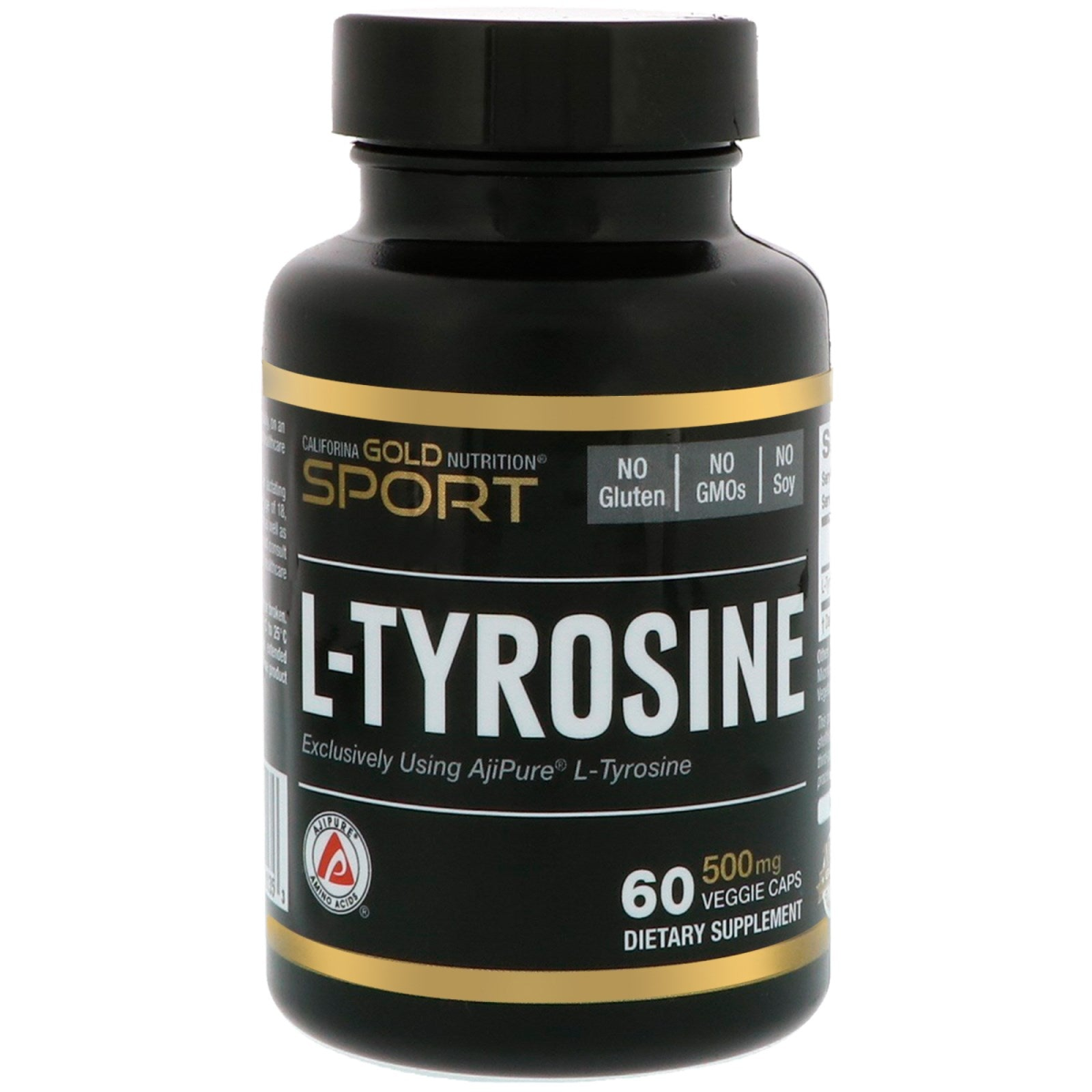 AjiPure® L-Tyrosine Sourced from AJINOMOTO® Supports Mental Alertness* Plays an Important Role in Neurotransmitter Activity* Noted For Cognitive & Mood Enhancement & Mitigating the Effects of Stress* 60 Vegetarian Capsules Produced in a 3rd Party Audited cGMP Registered (Certified) Facility Formulated to Contain: No Gluten – No GMOs – No Soy 100% Gold Guarantee L-Tyrosine is a free-form amino acid that is a precursor to the neurotransmitters dopamine, norepinephrine, and epinephrine (adrenaline). Studies have suggested that supplementing with L-Tyrosine can have both physical and cognitive benefits particularly in scenarios that involve physical and environmental stressors.* California Gold Nutrition’s AjiPure® L-Tyrosine is exclusively sourced from AJINOMOTO® and undergoes multiple stages of Quality Control. AJINOMOTO® AjiPure® Amino Acids are produced by their Patented Ferment-A- Pure Technology. No Animal Products (Hair or Feathers) – Pharmaceutical-Grade – Suitable for Vegetarians Ingredients Pure L-Tyrosine - 500 mg California Gold Nutrition® Certificate of Analysis