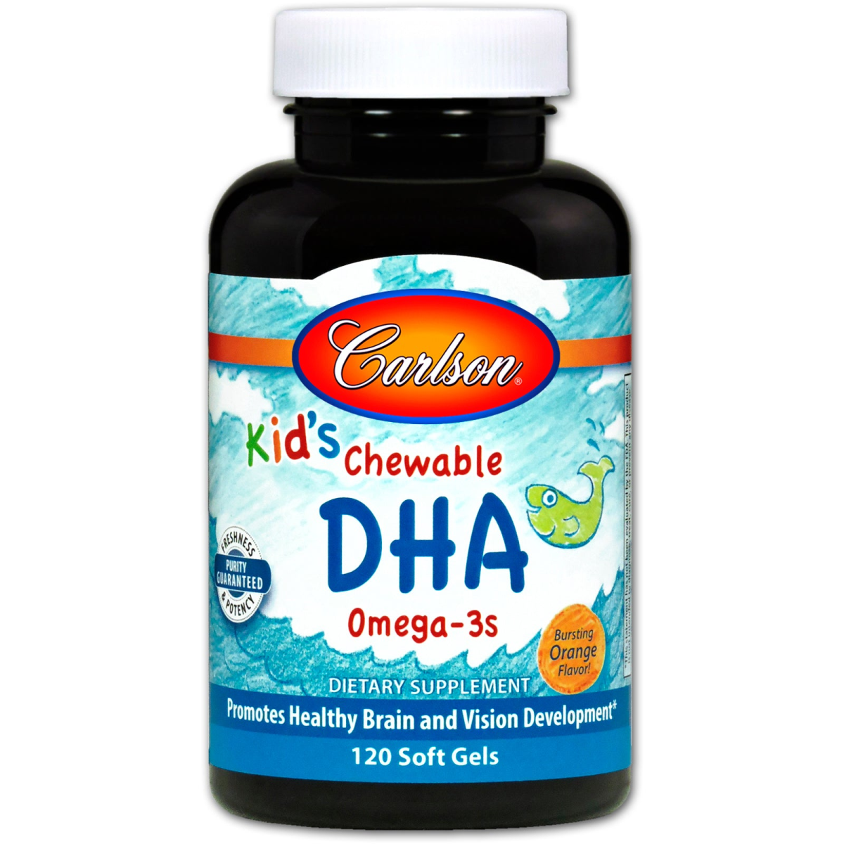 Freshness & Potency - Purity Guaranteed Omega-3s Dietary Supplement Promotes Healthy Brain and Vision Development Specializing in the Finest Norwegian Fish Oils Since 1982 Gluten-Free Sugar-Free Preservative-Free Purity Guaranteed Carlson Kid's Chewable DHA provides 100 mg of DHA per chewable, orange flavored soft gel. DHA is an important omega-3 that promotes brain and vision development in growing children.