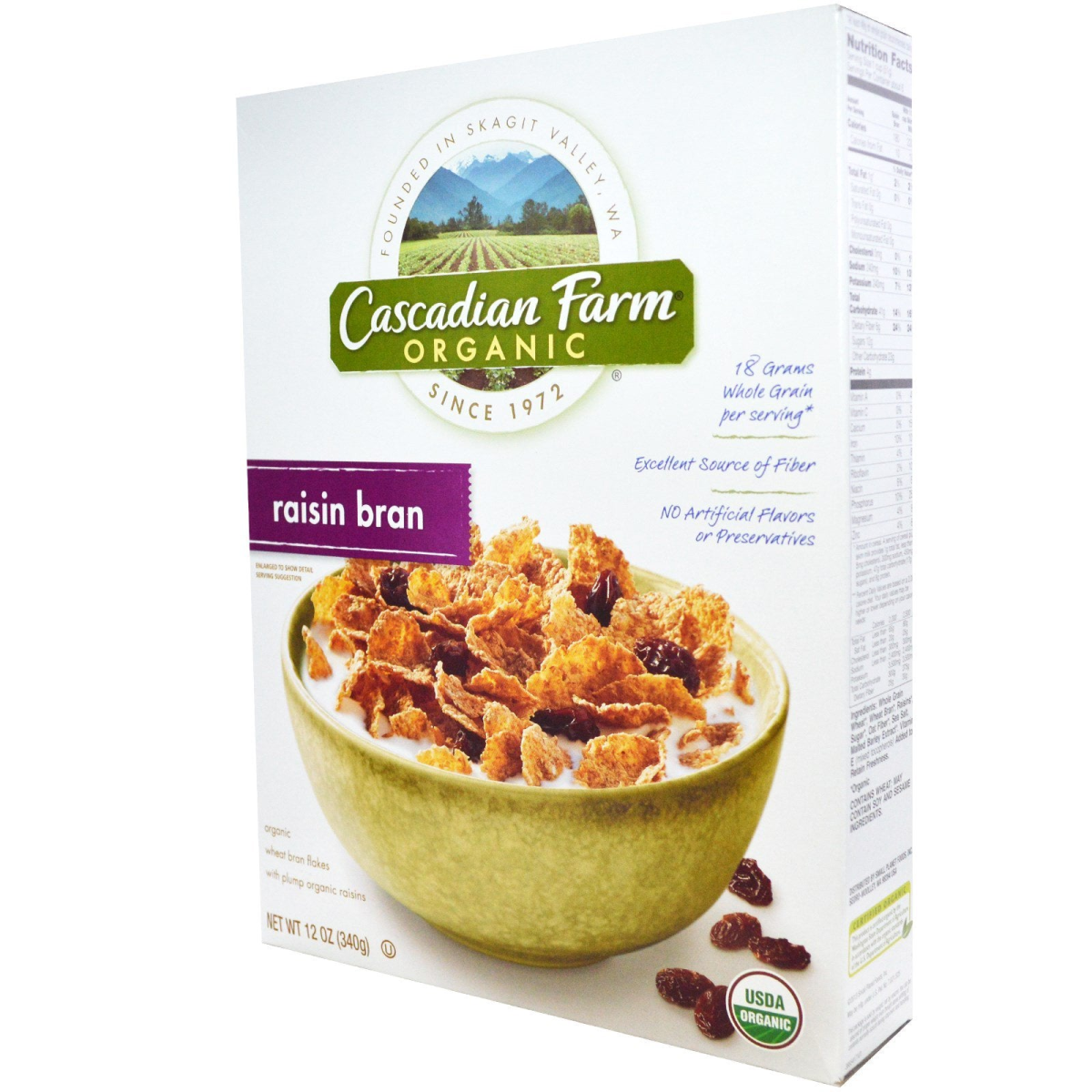 Since 1972 18 Grams Whole Grain Per Serving Excellent Source of Fiber No Artificial Flavors or Preservatives Wheat Bran Flakes With Plump Raisins USDA Whole Grain 18g or More Eat 48g or More of Whole Grains Daily Certified by the Washington State Department of Agriculture Certified . Guaranteed Delicious. When we founded Cascadian Farm in 1972, we knew that good food started with caring for our land. We're still tending our farm in the foothills of Washington's Cascade Mountains and also partnering with other farmers who share our commitment to bringing you delicious foods. So you can be sure every bite is good for you, your family, and the world we share. Why Eat All Cascadian Farm food is grown: Without synthetic pesticides Without genetic engineering (GMOs) Without chemical fertilizers In addition, they contain no artificial flavors or artificial preservatives