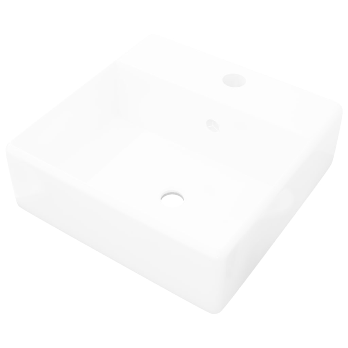 This square wash basin, made of premium ceramic, will be a stylish addition to any bathroom, washroom or powder room. Its high gloss finish brings a modern yet elegant design. This artistic ceramic basin is not only just a practical vessel for everyday use, but an adornment for your living space. It will definitely suit any interior style. In addition, the basin is quite easy to clean. An overflow is equipped to flow water out when it gets too full. A 3,5 cm faucet hole is included to install a tap. The drain hole is 4,5 cm in diameter. Please note that no drain is included in delivery. If you want to wall mount this basin, it needs to be supported by a pair of brackets. Please note these brackets are not included in delivery.
