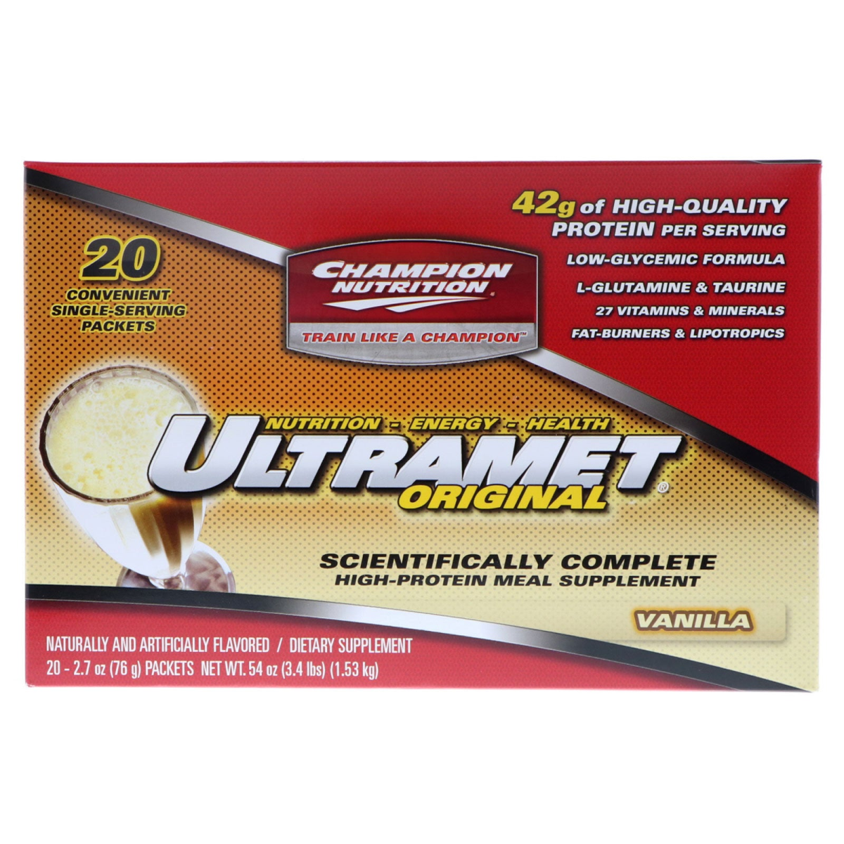 20 Convenient Single-Serving Packets Train Like a Champion 42 g of High-Quality Protein Per Serving Low-Glycemic Formula L-Glutamine & Taurine 27 Vitamins & Minerals Fat-Burners & Lipotropics Nutrition - Energy - Health Scientifically Complete High-Protein Meal Supplement Naturally and Artificially Flavored Dietary Supplement Ultramet can be an important part of a healthy lifestyle that includes a proper diet and fitness program. You Never Knew a Healthy Lifestyle Could be This Delicious! You grew up thinking that if something tasted good it couldn't be good for you. That's all changed now. Ultramet's rich flavor will have you looking forward to your next glass! You may not stop often to eat, but when you do, you don't want to sacrifice the satisfaction you get from a good-tasting meal. Ultramet is high on flavor and satisfaction, but low in carbs and fat. It will change your perception of meal supplements forever! The Diet Alternative: Feel Great on the Go! As busy as we are, dieting for many of us means simply missing a meal. We may quickly find we are missing more—energy, mental clarity, and a positive attitude. Ultramet is a high-performance meal supplement that delivers a complete array of nutrients to fuel your body, feed your muscles, help improve your overall well-being, and boost your body's energy levels—all this in a delicious, convenient and calorie-efficient way. Combine Ultramet with a regular exercise program and see the difference in your physique. LowFat, Low-Calorie Nutrition One serving of Ultramet contains 42 grams of easily digested protein, which delivers a full spectrum of the 9 essential amino acids, only 2 grams of fat, and just enough healthy complex carbohydrates to stabilize your blood sugar and satisfy you for hours. Fast and Easy A thick, rich Ultramet shake can be prepared in seconds! Just mix in a blender with water and ice cubes and you've got superior nutrition in a glass! Take a packet of Ultramet and a shaker with you, so you can always have lowfat energy and healthy nutrition at your fingertips. Superior Value Ultramet supplies more protein (over 80% of the Recommended Daily Value) and more nutrients (27 essential vitamins and minerals) for less money than many high-calorie fast-food meals or virtually any other food you could name. With Ultramet Your Busy Lifestyle Can Still Be Healthy It's difficult to take a break during a hectic day and treat yourself to a nice meal, but you deserve something more than a quick junk food snack. A delicious Ultramet shake only takes a moment to prepare and gives you an energy boost to get you through a long day—a delicious way to feel great! Ideal for Breakfast You don't need fat in the morning to slow you down and you certainly don't need sugar to kick-start a blood-sugar letdown, but many breakfast meals are loaded with fat or simple carbohydrates. Start your day right with an Ultramet shake and get your body moving in the right direction. One Ultramet shake for breakfast provides you sustained energy and solid nutrition to help you avoid those energy lulls, sugar cravings, and the potential for junk food binging. Pre- and Post-Exercise Finally, it's time for the workout you've been looking forward to all day. But how do you feel? If your last meal was several hours ago, you won't have the energy you need to perform adequately. Your workout will quickly become a burden rather than a pleasure. An Ultramet shake 1 hour before exercise will wipe away afternoon fatigue and fill your tank with easy-to-digest, high-octane fuel for maximum performance. If you exercise at a high intensity, drink another Ultramet shake after training to prevent the energy slump you may experience. Athletes You know that to reach your potential your body fat needs to be at an absolute minimum. At the same time you need to maximize lean muscle and energy levels. Ultramet continues the Champion Nutrition commitment to improve your nutrition by combining seven different