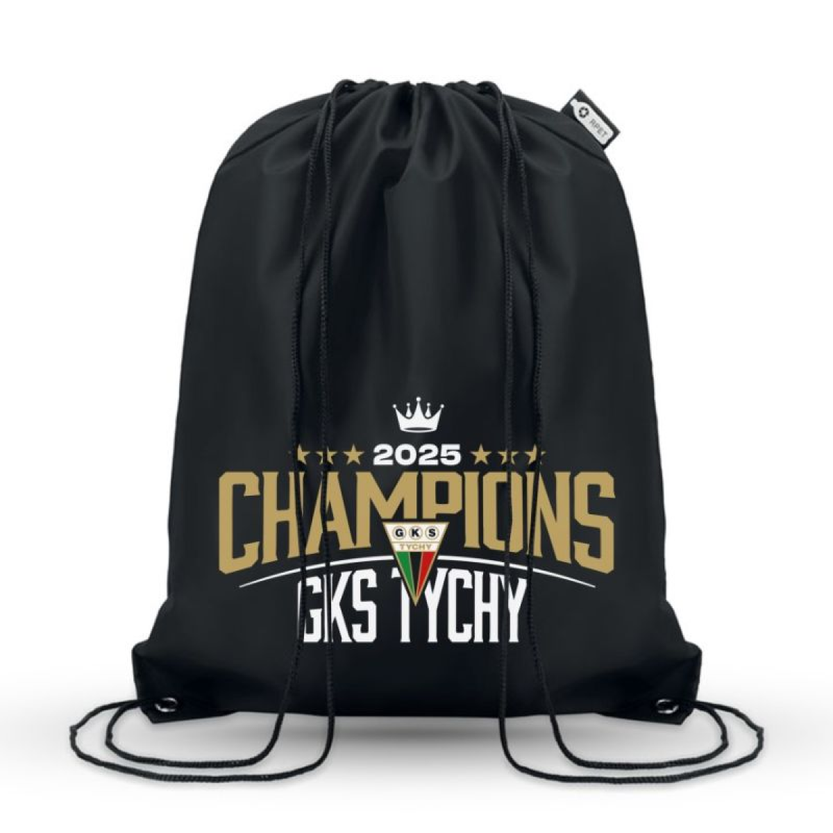 Champions 2025 GKS Tychy Drawstring Bag. Style, functionality, and club pride. This drawstring bag is made of RPET 190T, an eco-friendly material made from recycled plastic bottles. It combines practicality with environmental care. Equipped with strong polypropylene (PP) drawstrings. Key features: Official club product: The bag features a striking gold CHAMPIONS 2025 inscription and the GKS Tychy crest, adorned with a crown and stars symbolizing the club's successes. Functional and lightweight: Easy to carry thanks to the drawstring closure. Versatile: Perfect for sports equipment, shopping, or travel. Dimensions: 40 x 36 cm. The Champions 2025 GKS Tychy Drawstring Bag will allow you to proudly celebrate GKS Tychy's championship season.