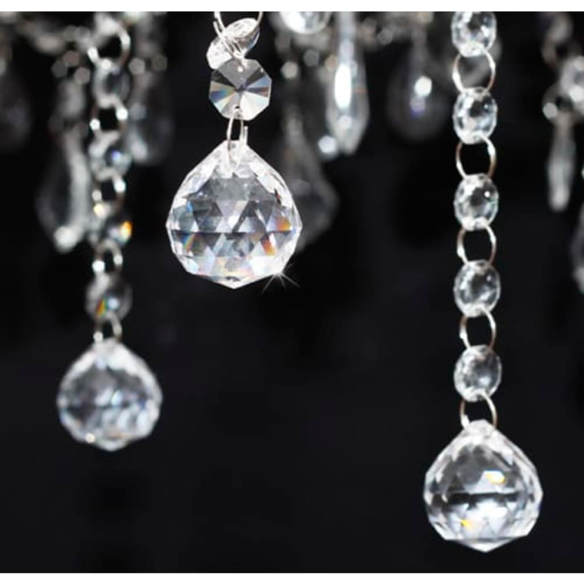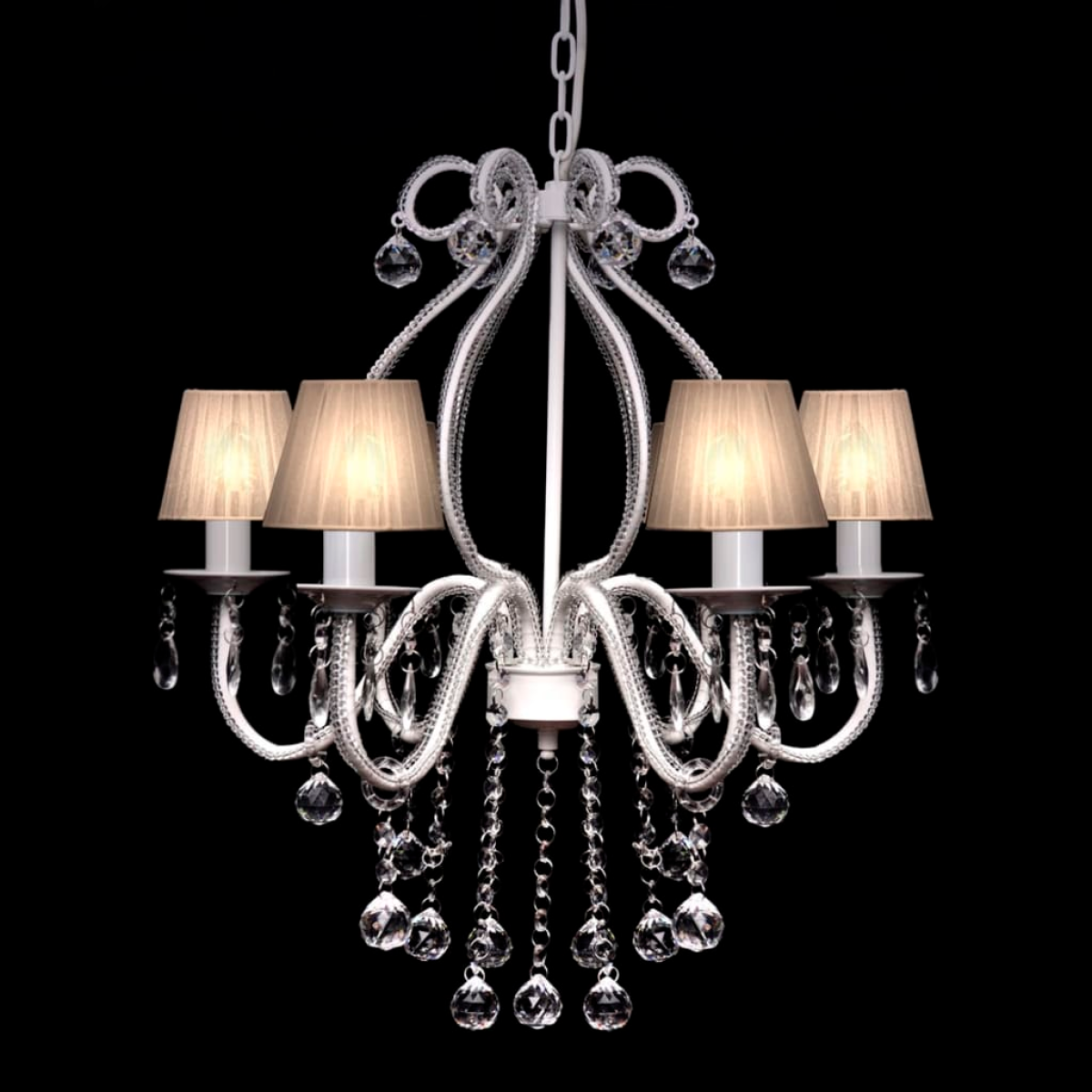 This gorgeous chandelier with 2300 different crystals is entirely made of metal and real glass crystals (no cheap plastic parts and stones) which provides you with a unique elegance. The chandelier has a metal and chrome housing with 6 flames, every flame has a separate lampshade of translucent white yarn. The trendy pendant has a royal crystal design. The high-quality colourless glass gives real clarity and shines with high light (even from other light sources), in the spectrum there will be a magnificent play of colours. This magnificent chandelier is mesmerizing with its 6 light sources and its polished prisms which provides you with a magical sparkle of pleasant and warm light. It is a real eye-catcher in any environment and ideal for private and industrial purposes.