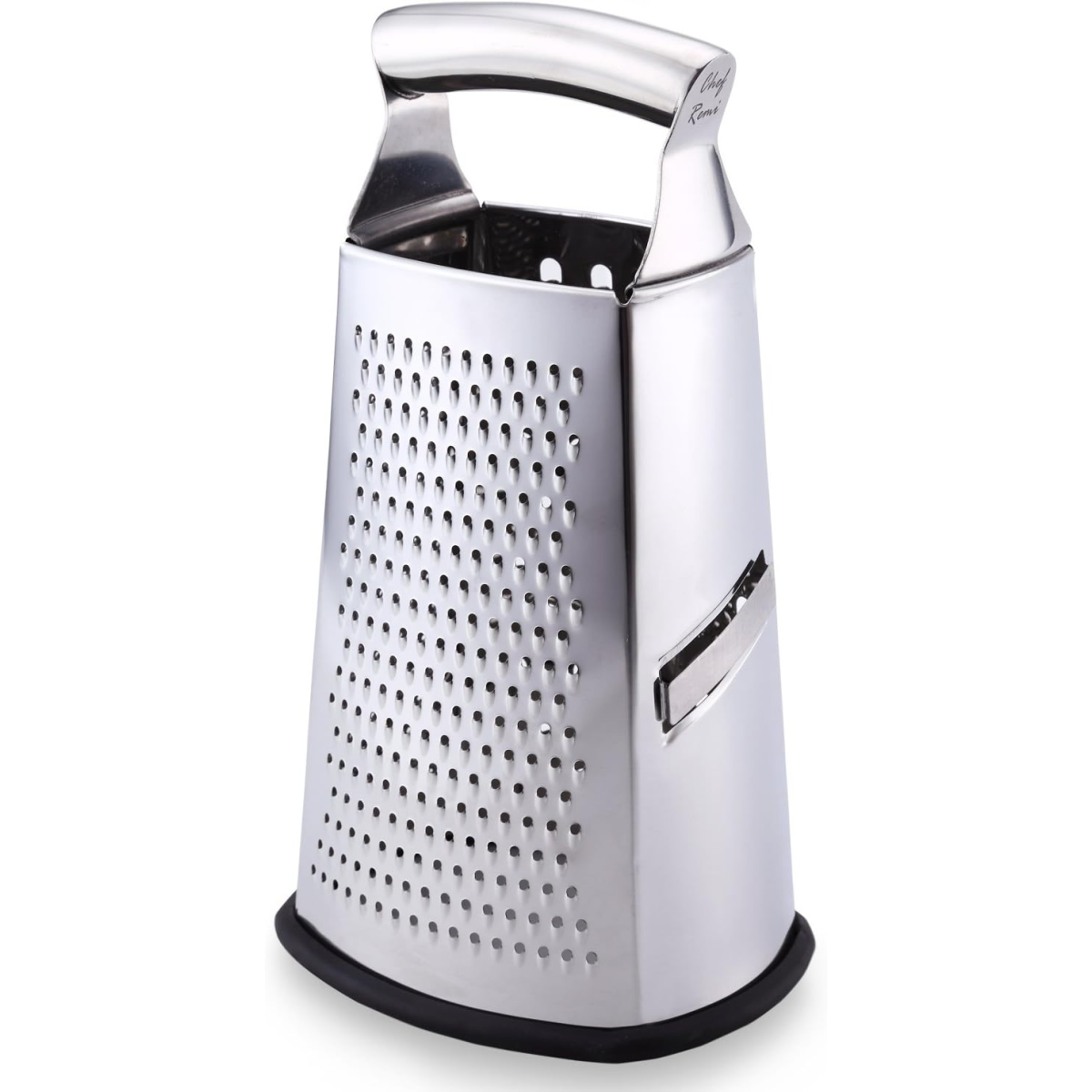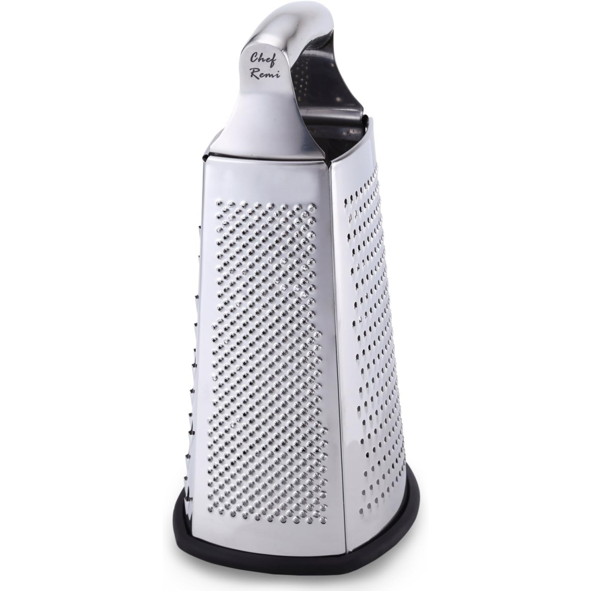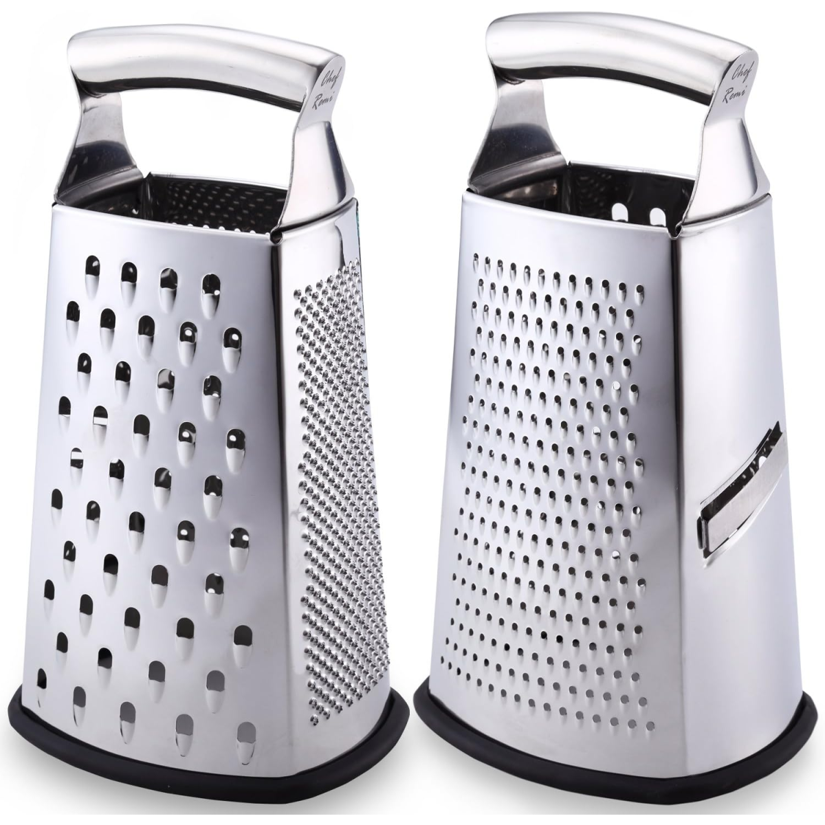 - Multi-functional - Our Food Grater is used for a variety of hard and soft cheeses including Parmesan as well as vegetables; potato, carrots, cabbage, coconut, cauliflower, cucumber, zucchini etc. In addition, it is used for a variety of fruits as well as butter, ginger, garlic, nuts and many herbs and spices. The sturdy box grater is popularly used as an egg slicer, egg grater, lime zester, lemon zester, orange zester and chocolate grater.