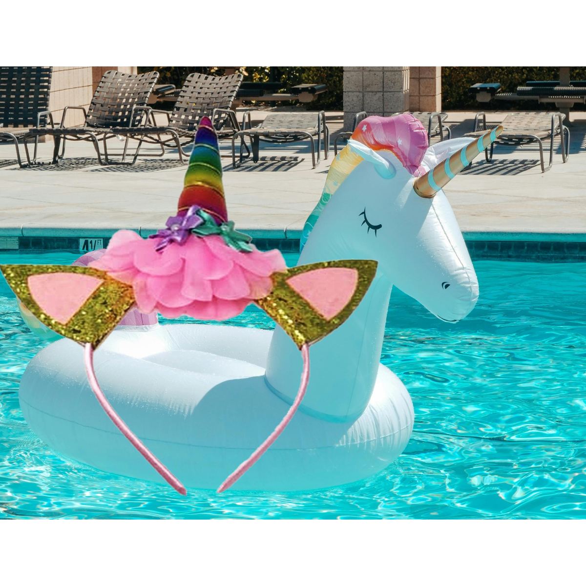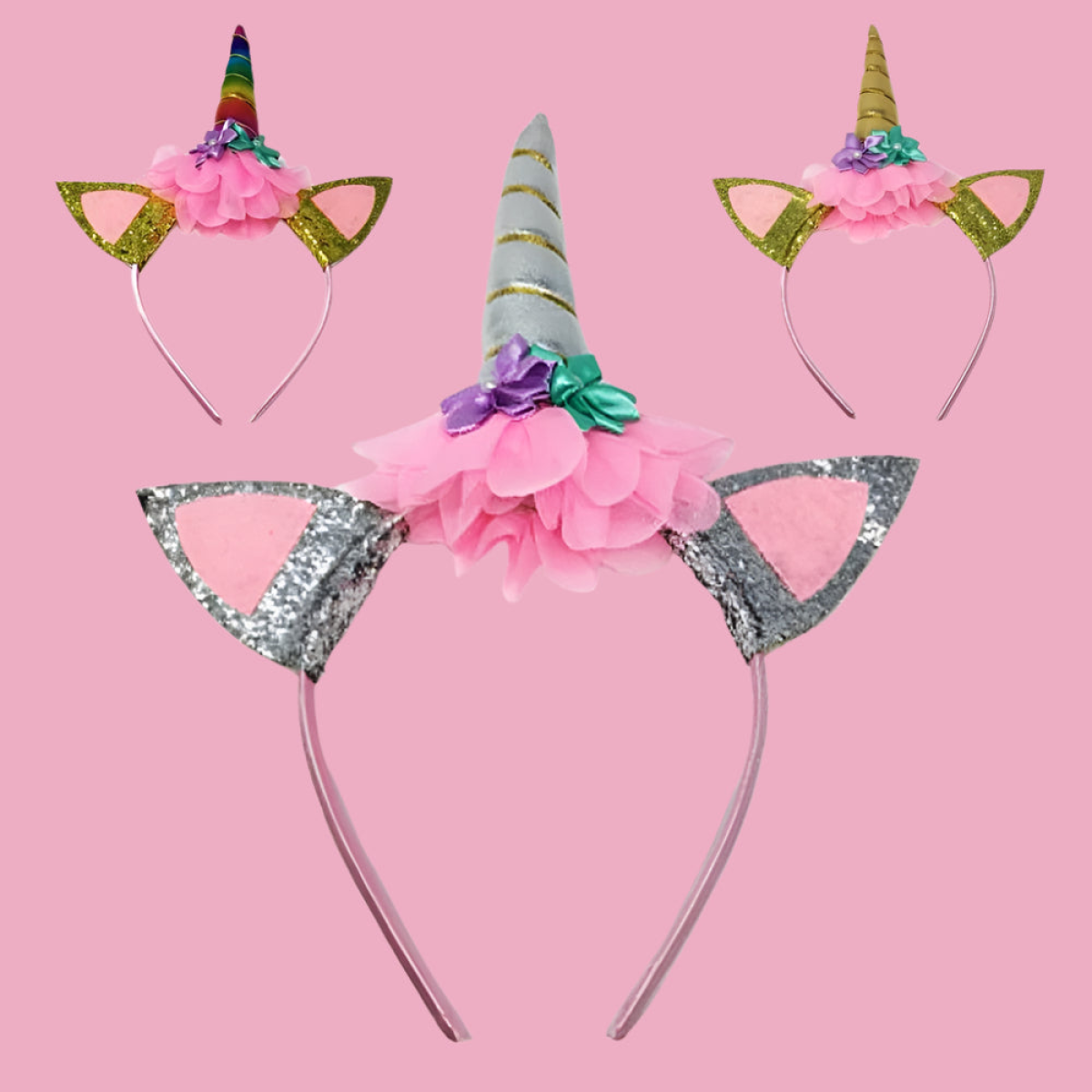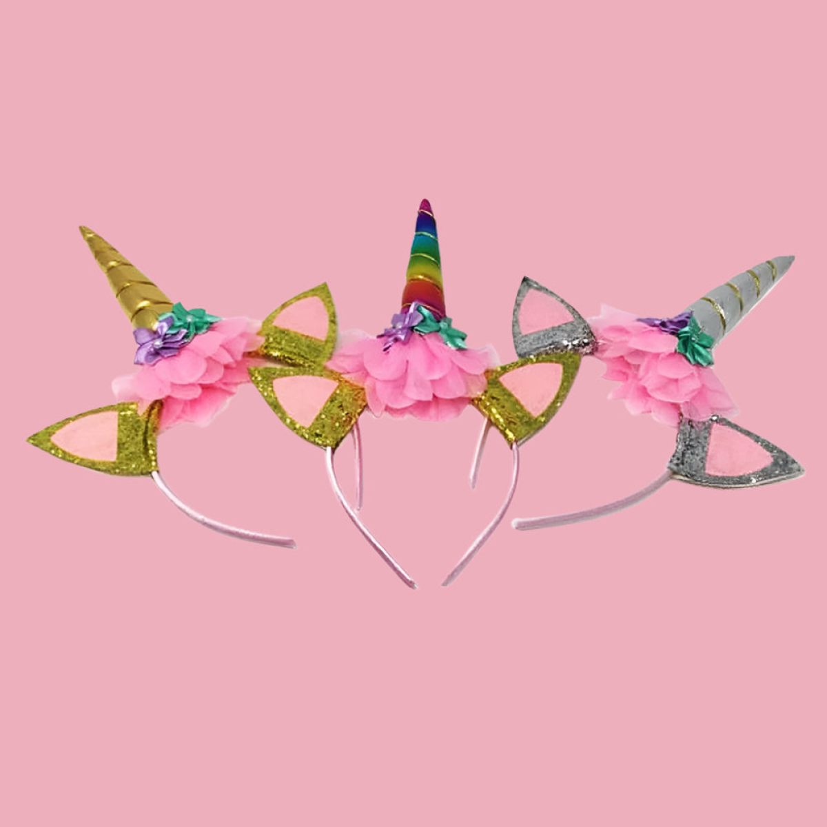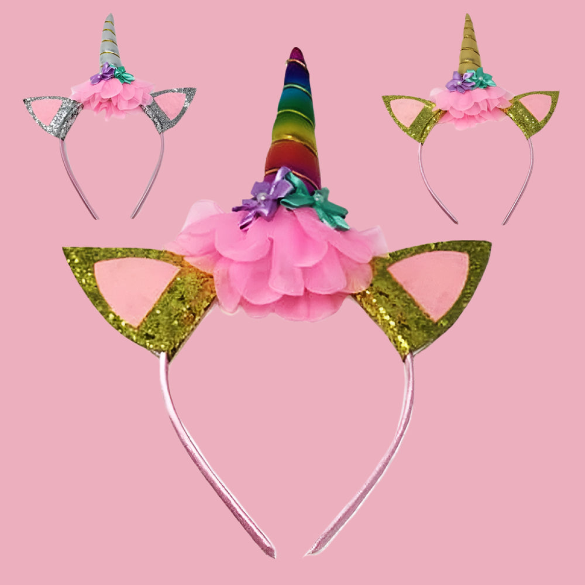 • Three Unicorn Headbands: Choose from Silver, Gold, or Rainbow unicorn horns, each with gold wrap-around, pink headrest, glitter ears, and colourful flowers.