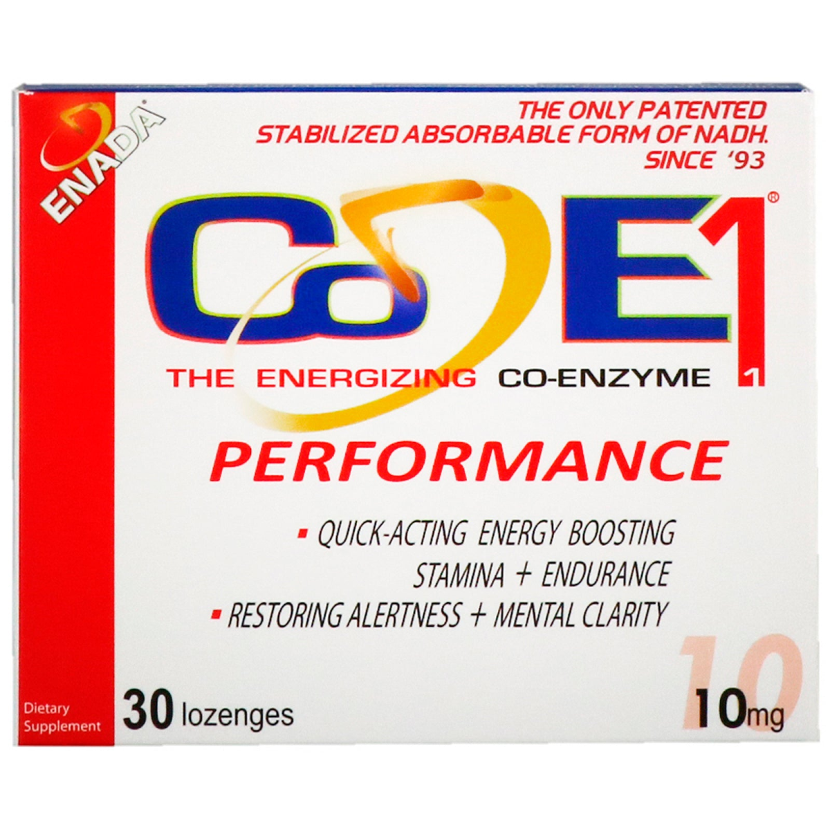 Enada Since '93 Quick-Acting Energy Boosting Stamina + Endurance Restoring Alertness + Mental Clarity Dietary Supplement Replenish Your Levels of Health Guaranteed for Purity, Freshness and Potency The only patented stabilized absorbable form of NADH. To quote Dr. Birkmayer "NADH is the biological Rocket Fuel. It is the biological form of hydrogen which reacts with the oxygen present in our cells to produce energy. The more NADH we have, the more energy we can produce." ENADA Co-E1 NADH is Co-Enzyme 1, the antioxidant form of vitamin B3. Co-Enzyme 1 is a naturally occurring enzyme found in all living cells and is necessary for cellular ATP development and energy production. CoEnzyme 1 is absorbed by the body and enhances your ability to restore the body's cellular (ATP) energy source.