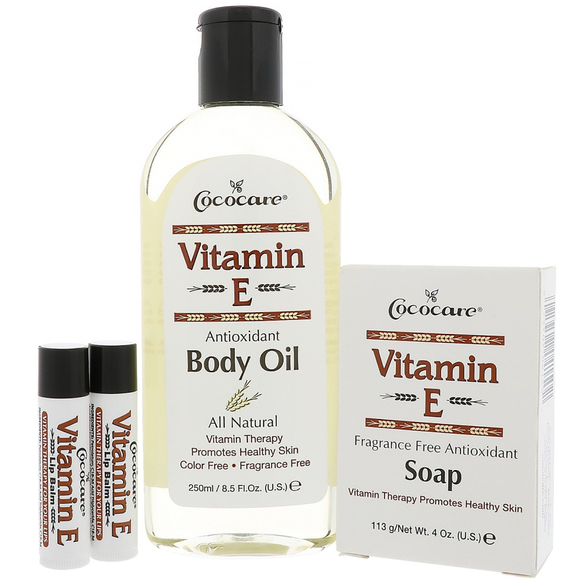 All Natural Vitamin Therapy Promotes Healthy Skin Color Free Fragrance Free Antioxidant A natural alternative for every day skin care. For use as skin conditioner, massage oil, or bath additive. This all natural oil softens and soothes. Regular use will help restore healthy skin tones. Includes: Vitamin E Antioxidant Body Oil, 8.5 fl oz (250 ml) Vitamin E Soap, 4 oz. (113 g) 2 Vitamin E Lip Balms, .15 oz (4.2 g) Vitamin E Soap: Fragrance Free Antioxidant Vitamin Therapy Promotes Healthy Skin Cleanses, Moisturizes & Protects It's more than soap...Cococare's Vitamin E Soap has a rich, moist lather that conditions, protects and gently helps you to maintain a natural glow. Pure soap without perfume. Ideal for all types of skin. Vitamin E Lip Balm: Vitamin Therapy for your lips