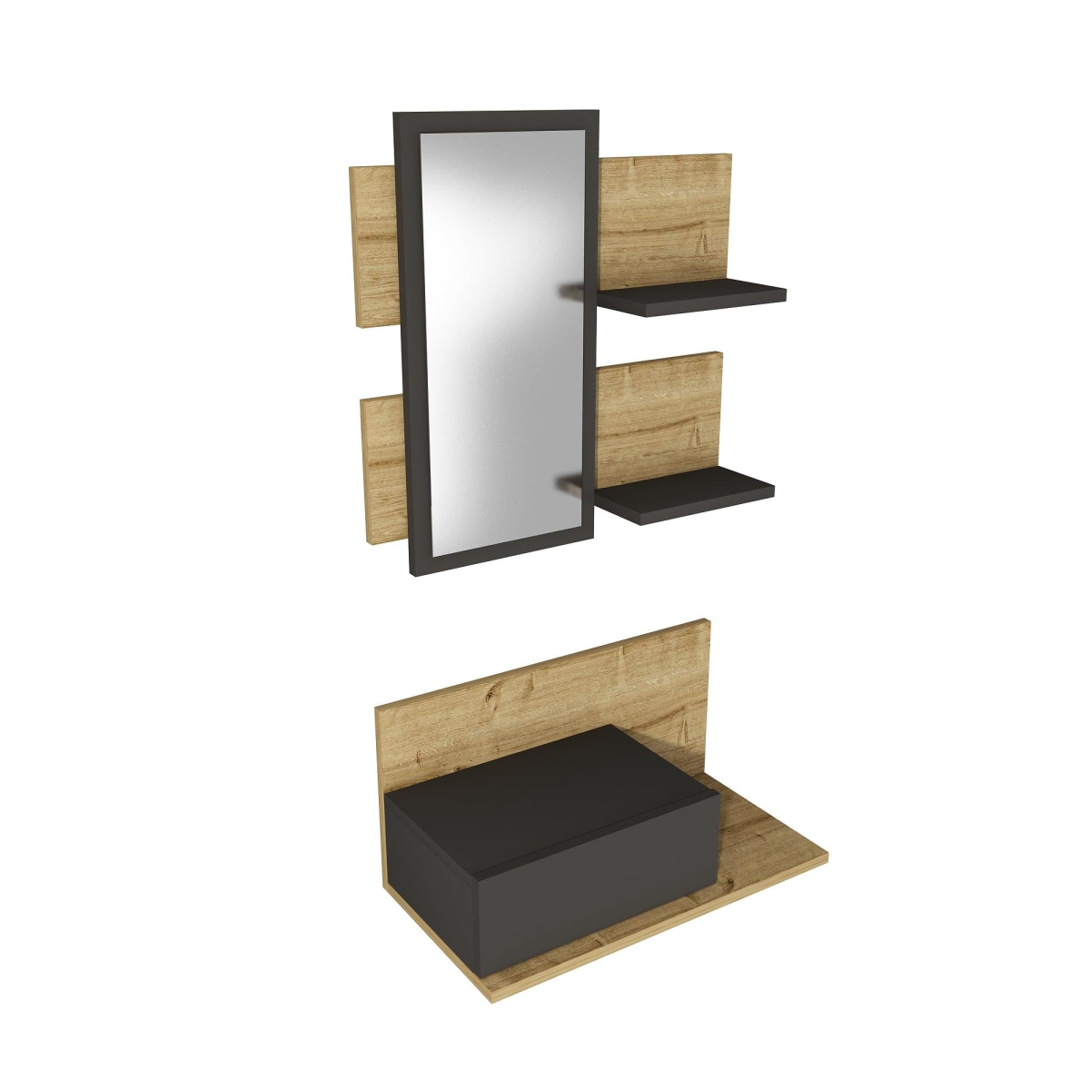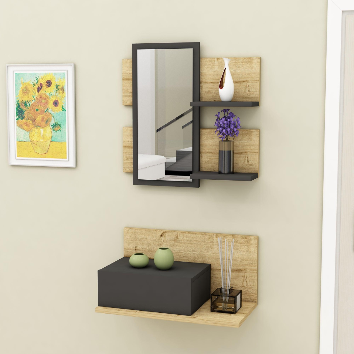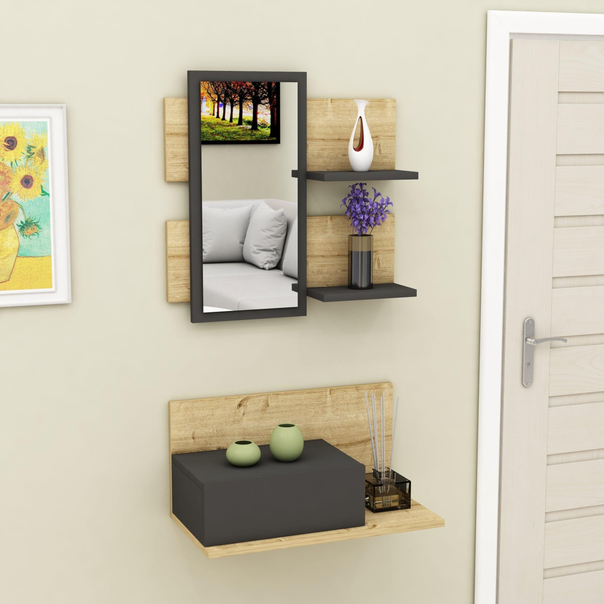 The Alloro console table with drawer and mirror is perfect for any modern home. Made of 18 mm thick particleboard with a melamine veneer finish, it is water-resistant and features a wall-mounted console table, shelves, a drawer, and all necessary wall-mounting hardware. With its stunning and modern look, Alloro will suit your hallway. Also, it is easy to store small items like keys.