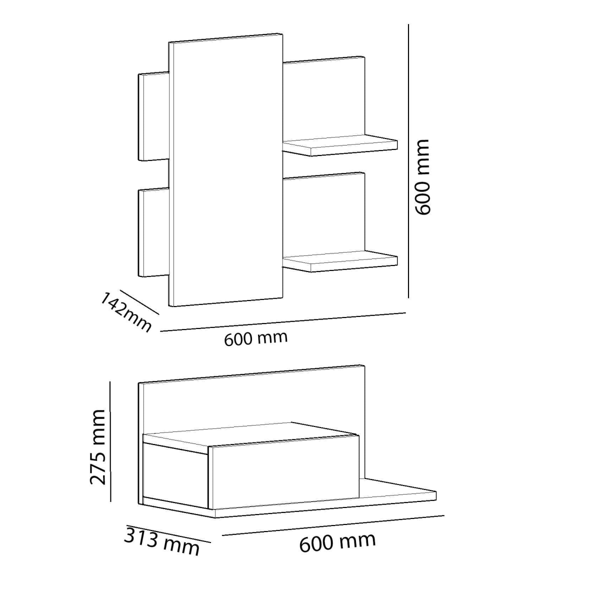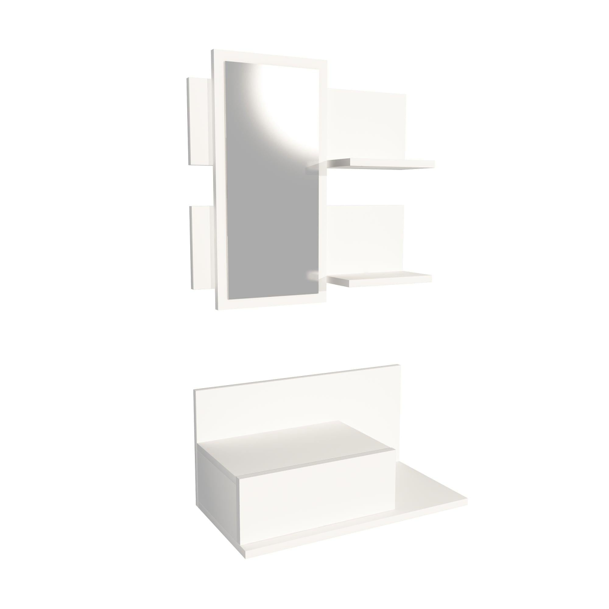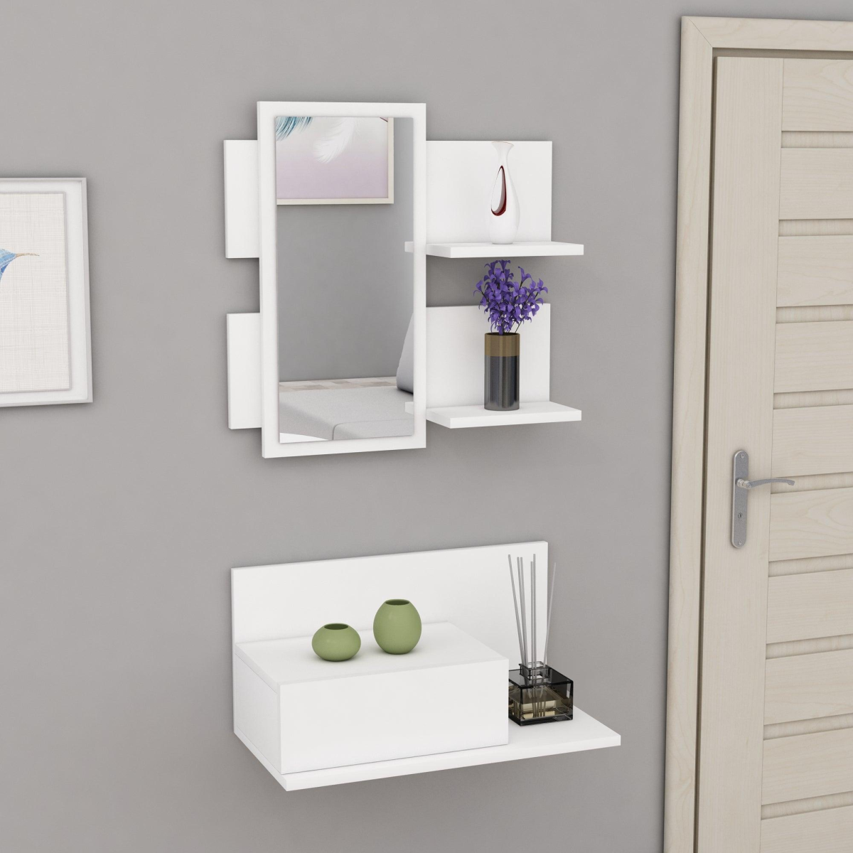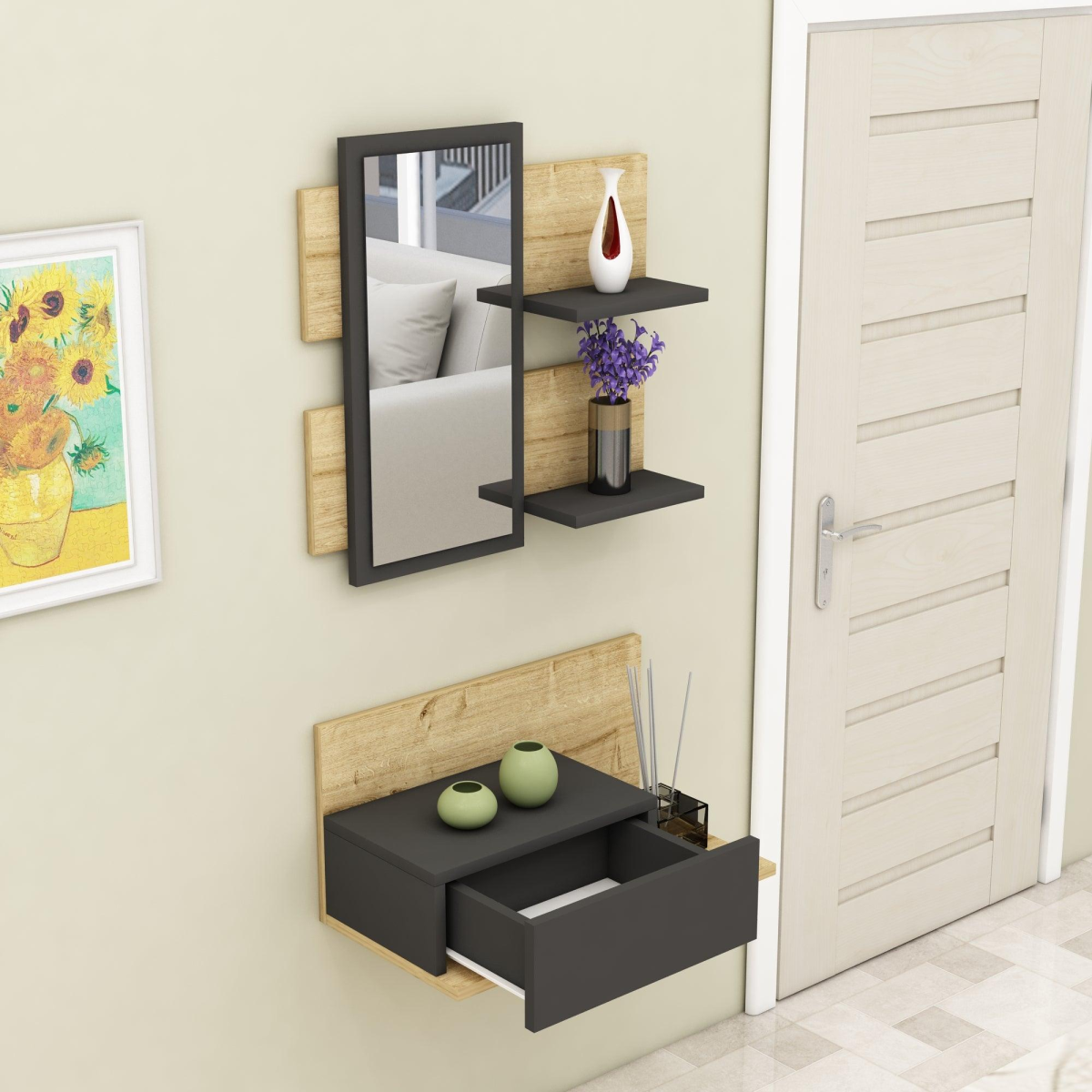 The Alloro console table with drawer and mirror is perfect for any modern home. Made of 18 mm thick particleboard with a melamine veneer finish, it is water-resistant and features a wall-mounted console table, shelves, a drawer, and all necessary wall-mounting hardware. With its stunning and modern look, Alloro will suit your hallway. Also, it is easy to store small items like keys.