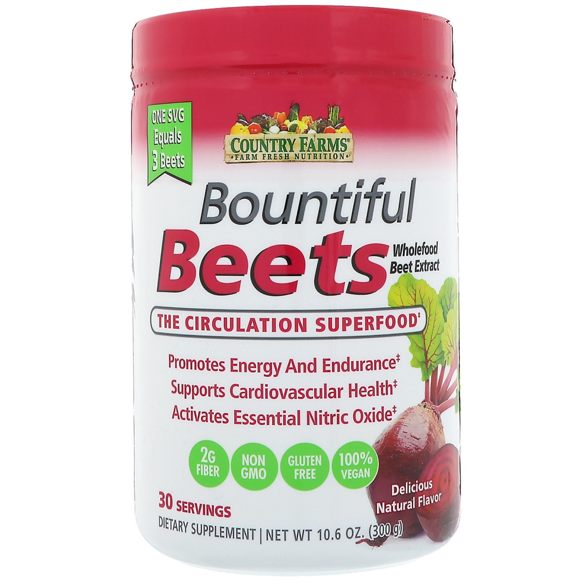 Farm Fresh Nutrition Wholefood Beet Extract 2 g Fiber Non-GMO Gluten-Free 100% Vegan One SVG Equals 3 Beets Promotes Energy and Endurance Supports Cardiovascular Health Activates Essential Nitric Oxide 30 Servings Dietary Supplement Country Farms Bountiful Beets - the Circulation Superfood - brings the power of pure beets to life in a delicious, convenient drink mix. Bountiful Beets is bursting with health building nitrates to help boost your body's natural production of nitric oxide. What's nitric oxide? It's the critical compound and master of regulator of your cardiovascular system. When taken on a daily basis, Bountiful Beets will naturally boost energy and improve stamina. To supercharge your intake of dietary nitrates and boost your energy, incorporate Bountiful Beets into your daily nutrition regimen. Each individual serving is equivalent to 3 beets. Enjoy this delicious beet powder mixed with water or add to your favorite smoothie to improve your energy levels and overall health and well-being.
