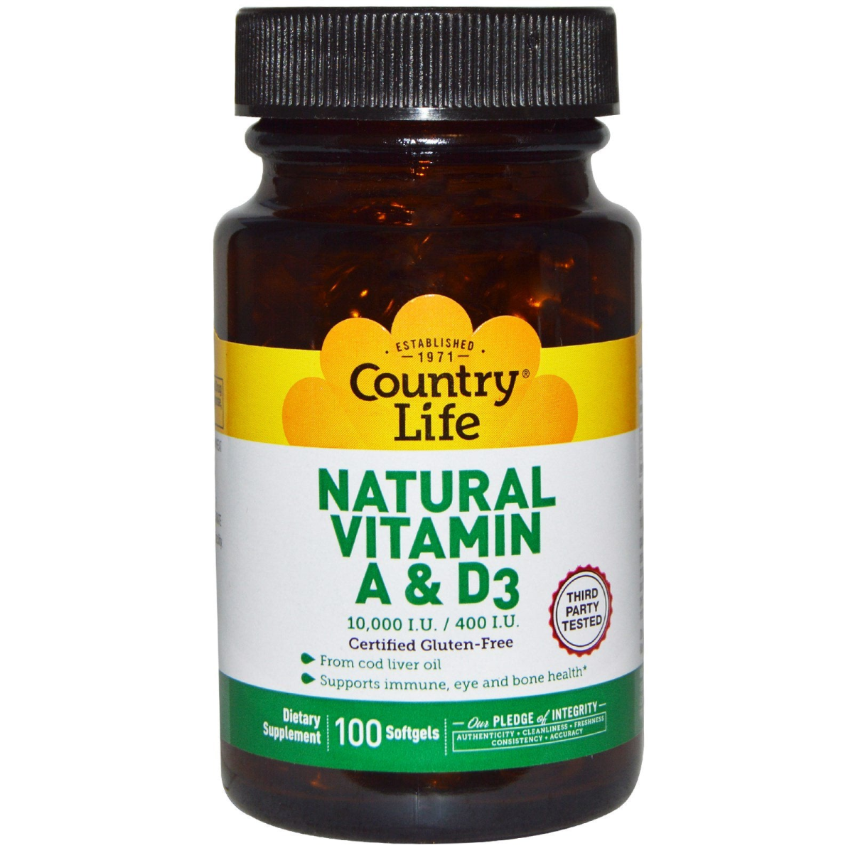 Established 1971 Third Party Tested Certified Gluten-Free From Cod Liver Oil Supports Immune, Eye and Bone Health Dietary Supplement — Our Pledge of Integrity — Authenticity Cleanliness Freshness Consistency Accuracy This product is sourced from cod liver oil, providing Both vitamins A and D3. As it is derived from fish liver oil it is third party tested for heavy metals such as mercury to ensure purity and safety.