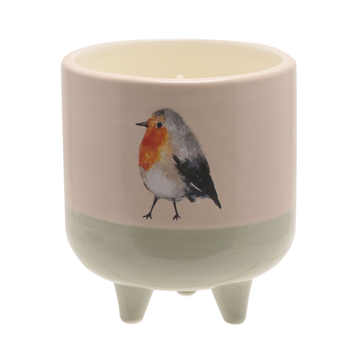 The ceramic footed vessel showcases both natural and green colouring, complete with a gorgeous, printed robin design. It houses an aromatic candle which will burn brightly for up to 35 hours.